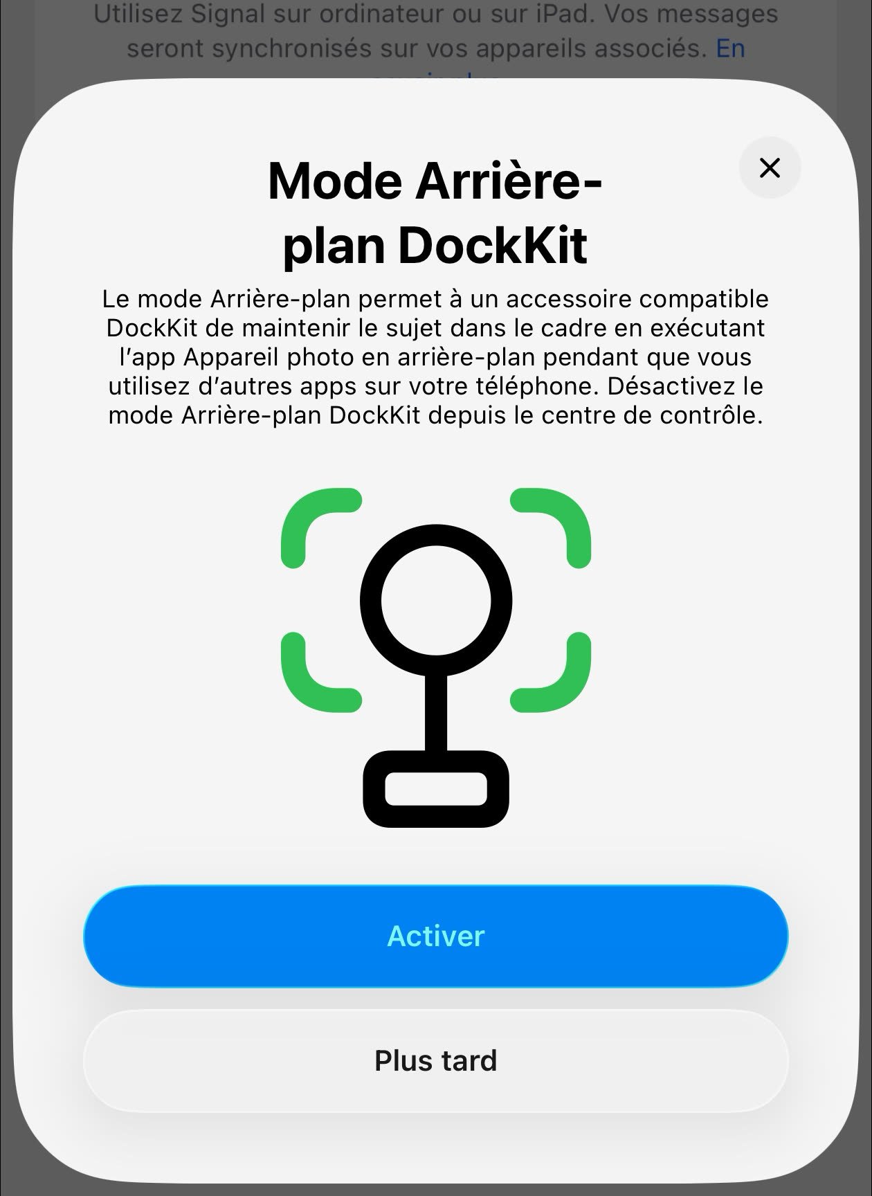 La technologie s'active en théorie avec une fenêtre pop-up, qui apparaît à l'écran sur l'iPhone. Une fois activée, une action dans le centre de contrôle permet d'activer (ou de désactiver) le suivi. Le problème, c'est qu'avec trois iPhone — un iPhone 15, un iPhone 15 Pro et un iPhone Air — et trois périphériques (Insta360 Flow 2 Pro, le support Belkin et le DJI Osmo Mobile 8), la fonction n'est apparue que sur un des iPhone. Avec les autres iPhone, la fenêtre d'activation n'apparaît pas… ni l'icône dans le centre de contrôle.