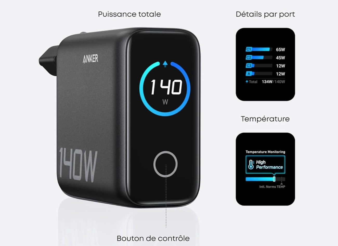 Une collection de briques disparates se transforme en une seule alimentation cohérente, alignée sur les usages modernes. Ce n’est peut‑être pas l’accessoire le plus spectaculaire, mais c’est souvent celui qui améliore le plus silencieusement la vie numérique au quotidien. Ugreen, encore eux, proposent le Nexode 100 W (47,99 €), de quoi brancher un MacBook Air, voire un MacBook Pro à la consommation légère en même temps qu’un iPhone et une Apple Watch. Gros consommateur ? La marque propose une version 160 W (62,99 €) dans le même format. Fan des lumières et autres écrans partout ? Anker propose le Zolo 140 W (69,99 €), muni de trois ports USB-C, un port USB-A, et un écran indiquant la puissance instantanée consommée sur chaque port, et la température de l’adaptateur.