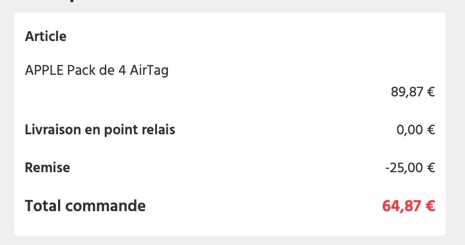 Les codes ne se limitent pas aux écouteurs. Cdiscount est déjà bien placé sur les AirTags, mais avec ces deux réductions, le pack de quatre passe à un peu moins de 65 €. C’est tout simplement inédit.