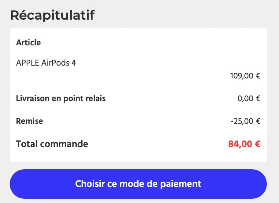 Les AirPods 4 sont proposés à un prix jamais vu en France. Sur Cdiscount, on peut acquérir les écouteurs d’Apple pour seulement 84 €. Par rapport au prix affiché sur l’Apple Store, cela représente une remise de 65 €. Une sacrée ristourne.