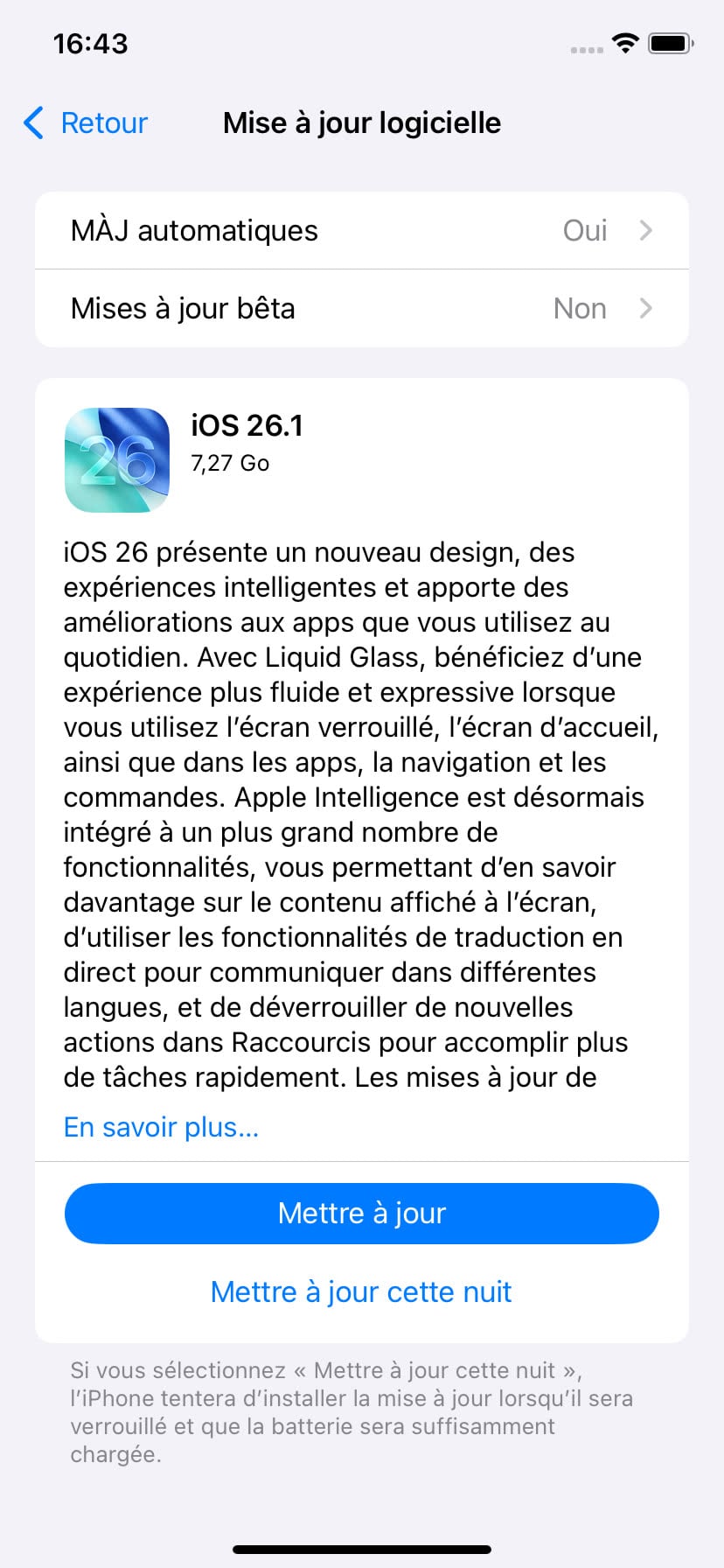 Sauf surprise de dernière minute, Apple devrait profiter de la semaine prochaine pour mettre en ligne l’ensemble de ses mises à jour en 26.2, ainsi qu’un dernier train de correctifs pour iOS 18 et iPadOS 18. Voici les mises à jour attendus et qui sont actuellement en RC.
