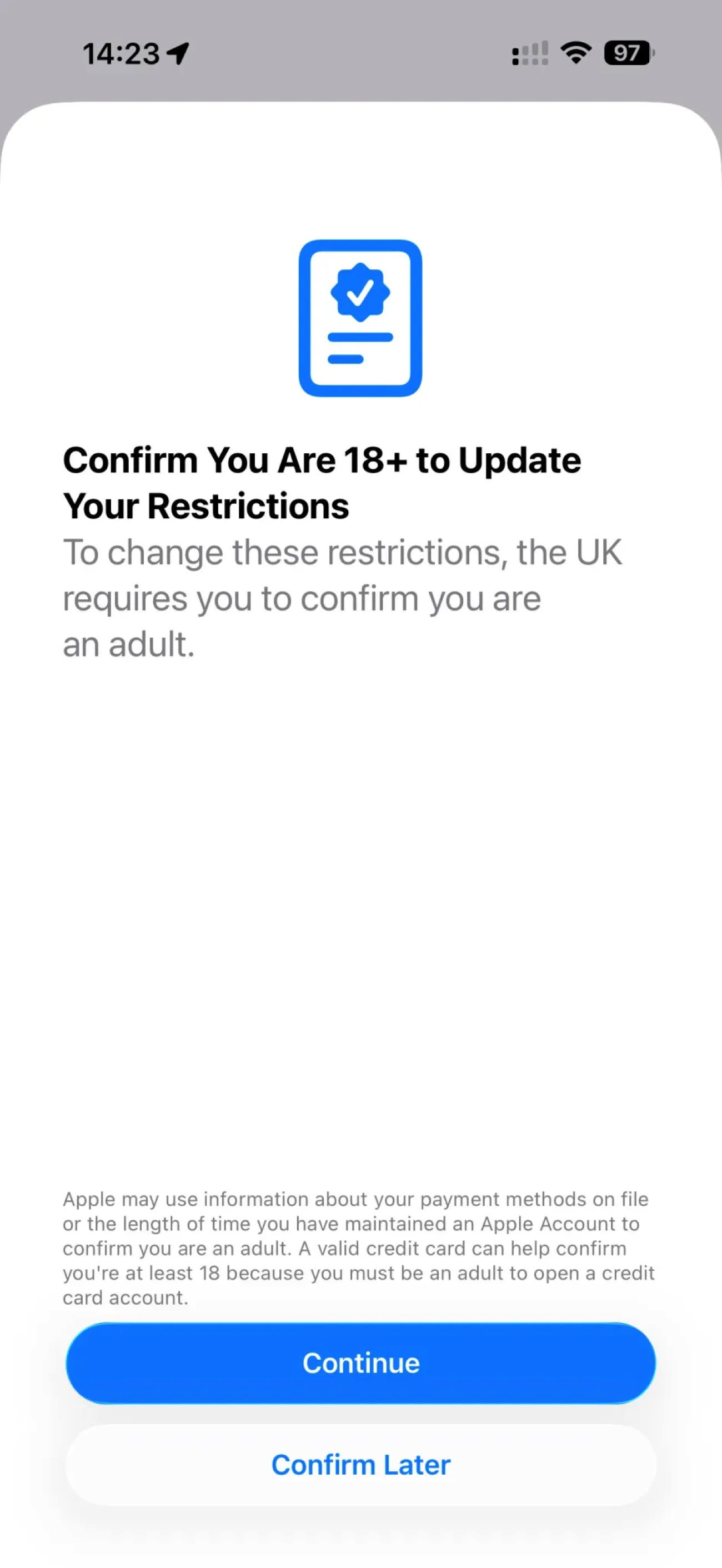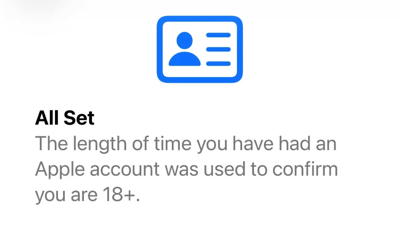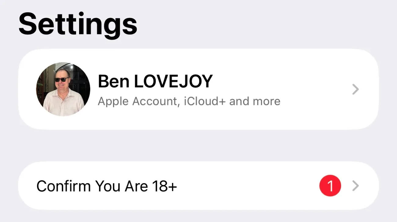 C’est le journaliste Ben Lovejoy de 9to5Mac qui en a parlé le premier, captures d’écran à l’appui. Après installation, une nouvelle section est apparue dans les réglages de son iPhone, l’incitant à confirmer qu’il était bien majeur. Une fois cliqué sur cet item, une fenêtre s’est ouverte, indiquant que son compte comportait des restrictions liées à l’âge imposées par la législation britannique : celles-ci ne seraient levées qu’une fois sa majorité confirmée.