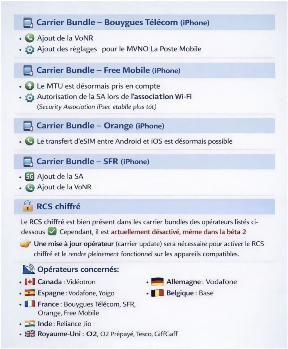 Toutefois, ne sabrez pas le champagne trop vite. Apple prévient dans ses notes de version : si le chiffrement de bout en bout pour le RCS est bien en phase de test, il ne sera pas activé pour le grand public lors de la sortie de la version finale d'iOS 26.4.