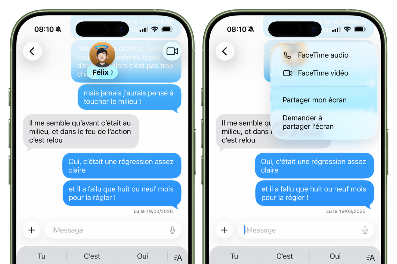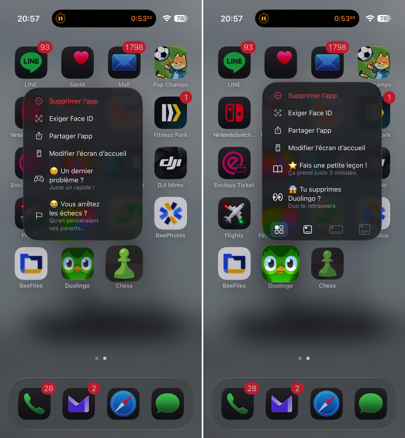 Le menu contextuel en faisant un appui long est apparu à l’époque de 3D Touch. Les utilisateurs l’oublient souvent… sauf au moment de désinstaller une application. Certains développeurs ont donc détourné son usage pour inciter à ne pas supprimer l’app, comme vous pouvez le voir sur les captures ci-dessus.