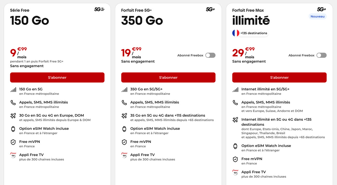 Le forfait historique à 19,99 €/mois reste en place sans changement. Il comprend toujours 350 Go de data en France et 35 Go dans 115 pays étrangers. Il est disponible à 9,99 €/mois avec 5G illimitée en France pour les abonnés Freebox Pop.