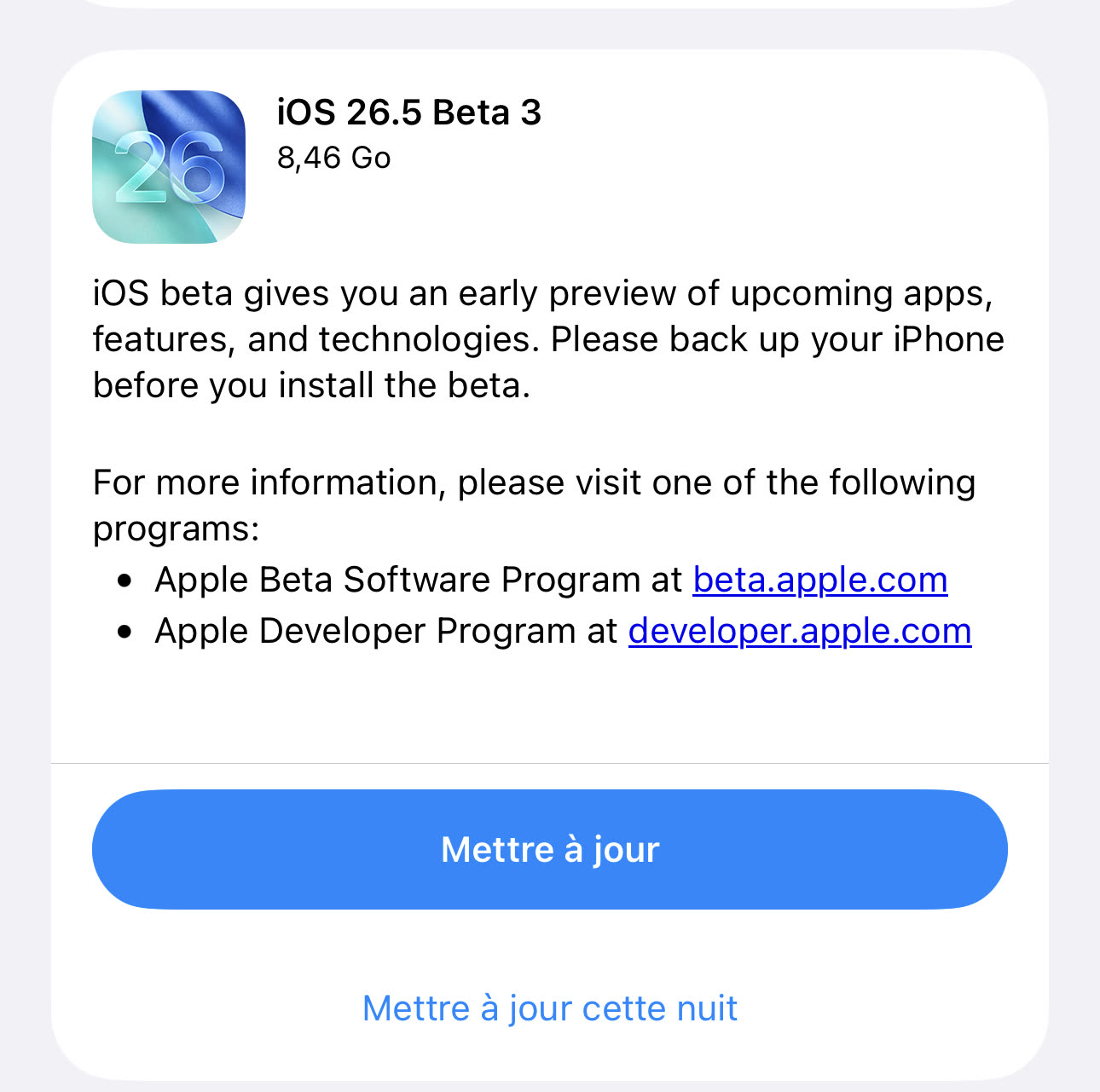 Belle soirée en vue pour les développeurs : Apple vient de mettre en ligne une troisième bêta pour iOS 26.5. macOS et iPadOS sont également de la partie, tandis que tvOS, watchOS et visionOS ne devraient pas tarder de suivre. Nous allons installer tout cela au plus vite et vous tiendrons au courant des nouveautés.