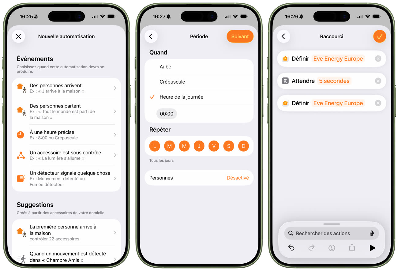 L’automatisation configurée dans Home Assistant et adaptée à mes besoins : elle se déclenche tous les jours juste avant midi, ne s’active que si le micro-ondes n’est pas en fonctionnement à ce moment-là, puis éteint la prise, attend cinq secondes et réactive la prise. Image iGeneration.Exemple d’automatisation configurée dans Maison : choisissez l’événement « À une heure précise » (gauche), puis minuit ou l’heure qui correspond à votre micro-ondes (centre), sélectionnez ensuite l’option pour convertir en raccourcis et ajoutez trois actions pour éteindre la prise, attendre un petit peu et rallumer la prise (droite). Image iGeneration.