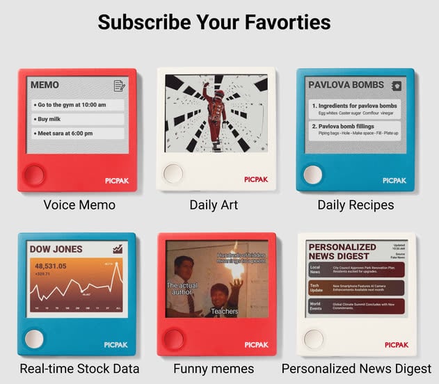 Si on peut y afficher des photos, les créateurs ont aussi pensé à d’autres informations. Le petit écran pourra ainsi se connecter à un serveur pour récupérer des citations, des actualités, des résumés ou encore une collection de memes. La qualité de la dalle reste très modeste avec une définition de seulement 400 x 300 pixels. L’écran E Ink couleur fonctionne via quatre pigments (noir, blanc, rouge, jaune), ce qui explique des limitations sur les bleus.