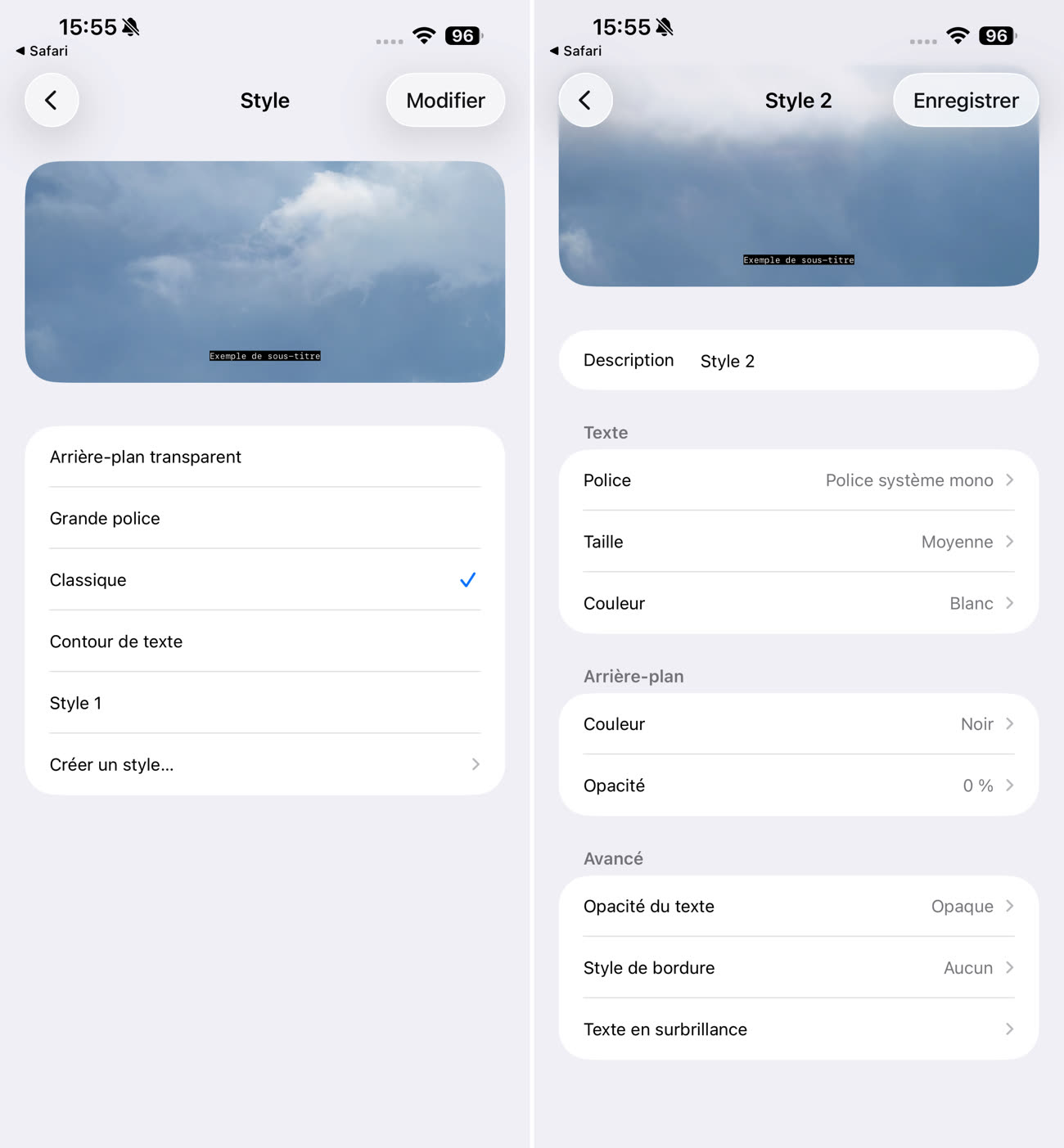En pratique, un nouveau bouton « Style » apparaît dans les réglages des sous-titres du lecteur vidéo. On peut alterner entre 4 styles prédéfinis créés par Apple, avec un classique, un ajoutant un arrière-plan pour mieux faire ressortir le texte, un autre donnant de grosses bordures aux lettres ou un dernier aux polices grandes tailles.