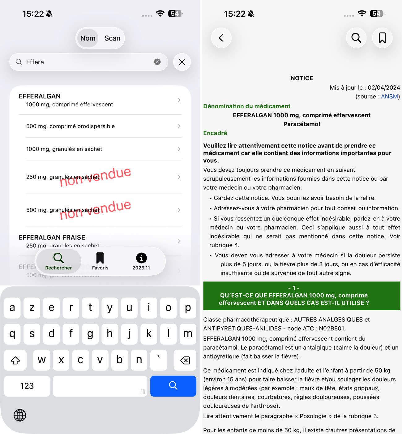 Notices médicaments est donc une chouette boîte à outils développée par le français Simon de Bernard. Elle repose sur le contenu des notices mis à disposition par l'Agence nationale de sécurité du médicament et des produits de santé (ANSM) et par l'Agence européenne des médicaments (EMA). Elle est téléchargeable gratuitement, mais un abonnement à 3 € par an est nécessaire pour voir les notices complètes. L’app fonctionne sur iOS 12.4 ou plus récente.