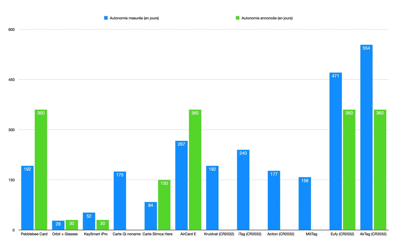 La conclusion de cet essai empirique, c'est que même sur un échantillon faible, les disparités sont bien visibles. Et la différence entre le traqueur d'Eufy et l'AirTag (d'un côté) et les quatre noname de l'autre est assez importante. Nous pouvons donc raisonnablement affirmer qu'il y a bien une différence de consommation réelle entre les modèles à bas prix et les autres. Nous sommes en train d'effectuer le même test sur un modèle Ugreen (vendu généralement dans la même zone de prix que le modèle Eufy), mais la période écoulée est trop courte pour conclure quelque chose. Nous pouvons juste noter qu'il est stable.