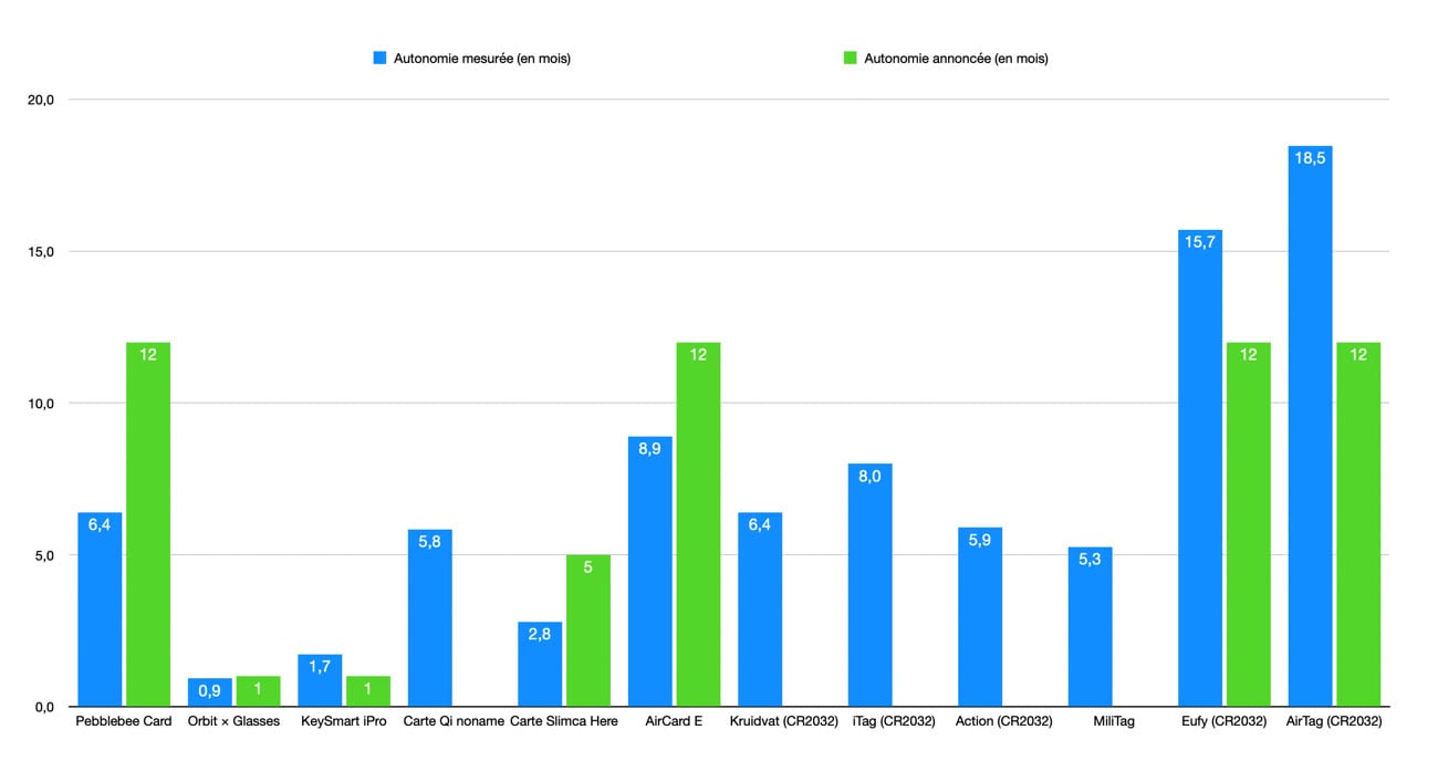 Comme vous avez pu le voir, il y a de grosses disparités entre les traqueurs. Notre échantillon n'est pas exhaustif, car il existe d’innombrables traqueurs sur le marché, mais il permet tout de même de voir que dans des conditions contrôlées, les modèles vendus plus onéreux — les AirTags et ceux d’Eufy — ont une autonomie largement supérieure aux modèles d'entrée de gamme, qui se trouvent facilement actuellement pour moins de 5 €.
