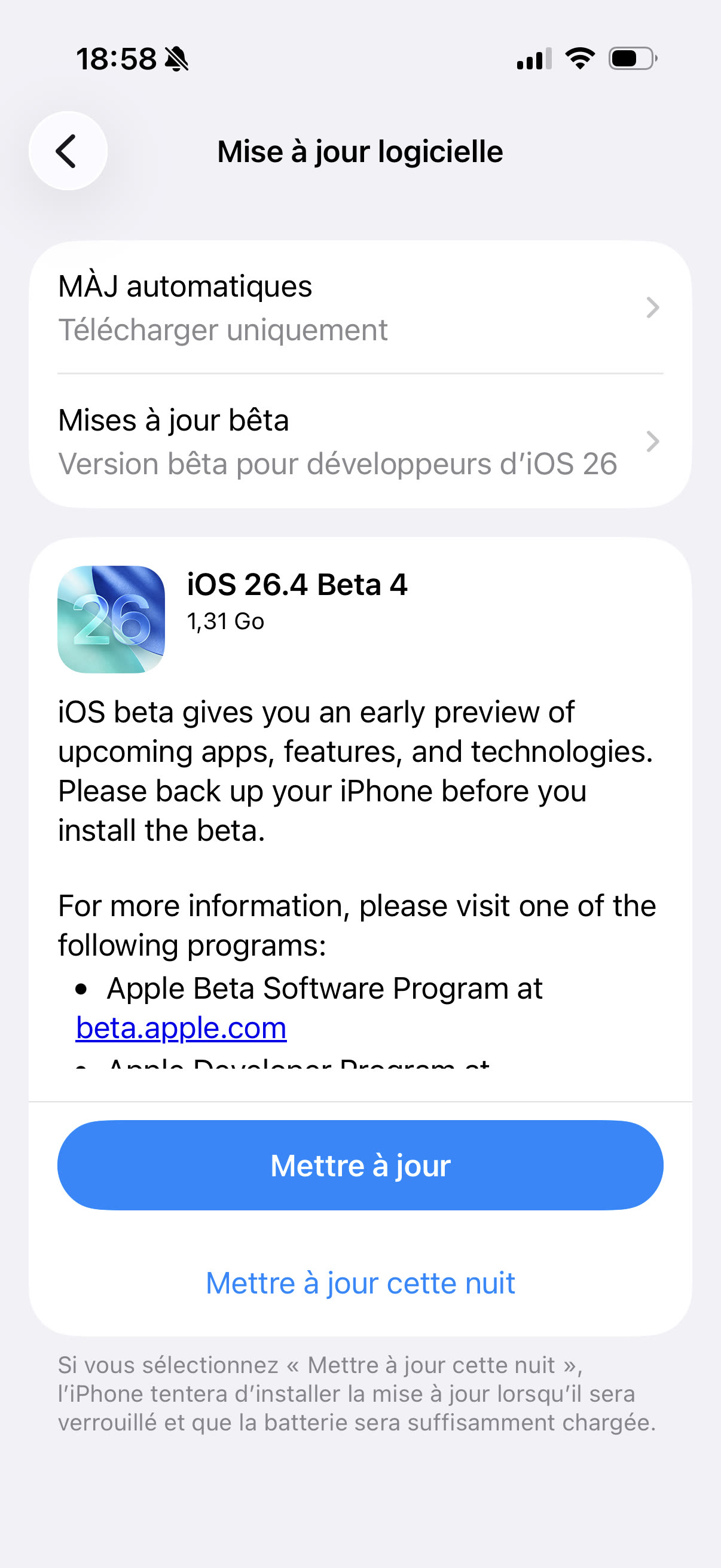 Le rythme ne faiblit plus à Cupertino, peut-être la preuve que le développement des systèmes d’exploitation est désormais assuré par Apple Intelligence. Une semaine après la troisième, quinze jours après la deuxième et trois semaines après la première, place à la quatrième bêta des OS 26.4. Comme toujours, il y en a pour tout le monde et même une heure à l’avance, car les États-Unis ont changé d’heure avec nous et devinez qui avait zappé cette information ? 🤦♂️