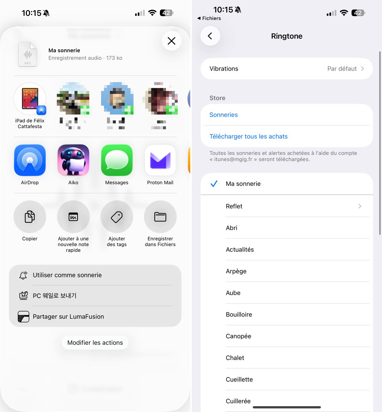 iOS 26 a bien simplifié la manière de créer une sonnerie personnalisée. S’il fallait auparavant bidouiller un peu pour cette fonction très basique, on peut désormais attribuer un fichier audio simplement depuis Fichiers ou l’app Dictaphone. Il suffit d’ouvrir le menu de partage et d’appuyer sur la nouvelle option au nom explicite.