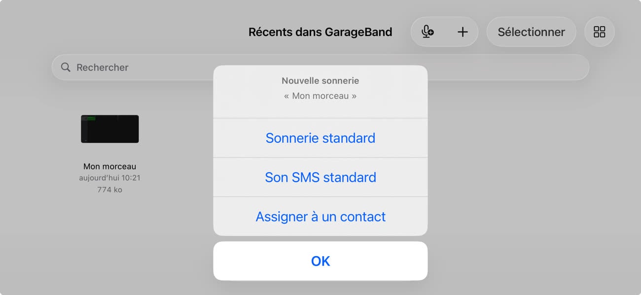 Il n’est malheureusement pas possible de choisir une sonnerie de messages aussi facilement. Pour cela, il faudra passer par GarageBand. La démarche est un peu plus compliquée étant donné qu’il faut créer un nouvel enregistrement, y faire glisser un fichier son avant de l’exporter comme sonnerie de SMS. On peut également l’assigner directement à un contact. Apple a un tutoriel plutôt complet pour les curieux.