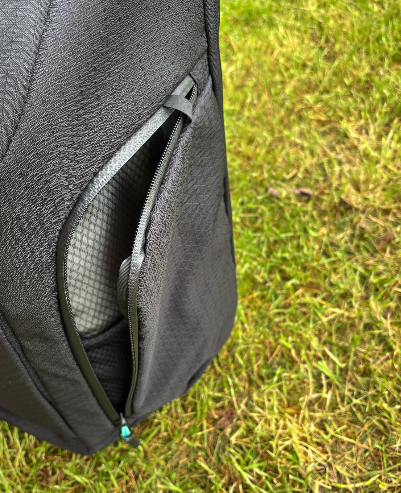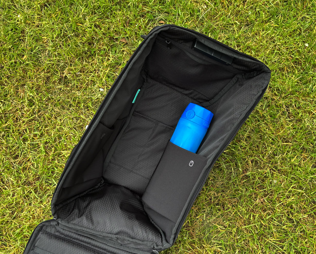 Sur l'extérieur, un rabat fixé magnétiquement cache le cadenas. On trouve aussi une poche principale (fermée) et deux poches latérales (fermées aussi). Une des deux contient un filet pour des clés, la seconde a été imperméabilisée pour éviter qu'une gourde ou une bouteille qui fuit ne puisse pas mouiller votre ordinateur.