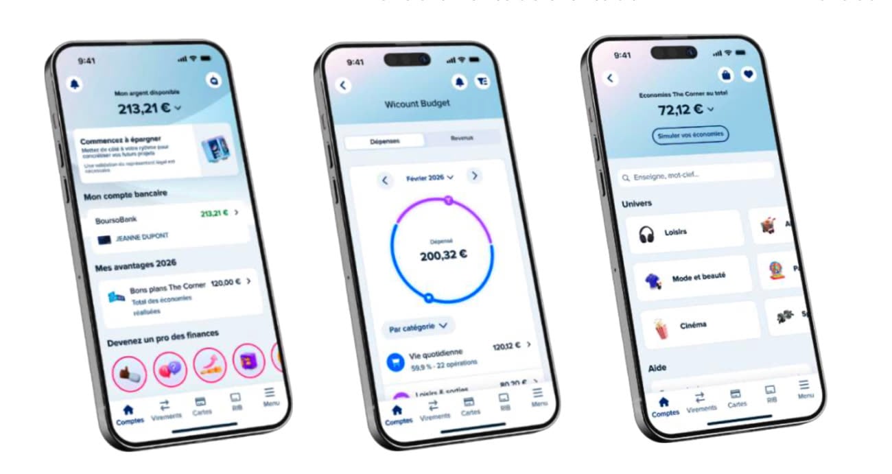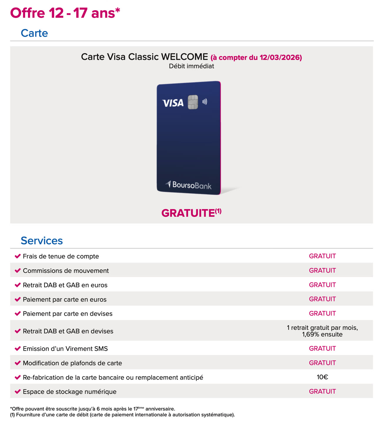 La formule, qui comprend toujours un compte bancaire gratuit, est maintenant ouverte aux enfants dès 10 ans au lieu de 12. Elle inclut une carte Visa Classic qui abandonne le mauve et le nom Freedom au profit d’un design bleu et de l’appellation Welcome. Autre nouveauté : la possibilité de créer des cartes virtuelles, temporaires ou non, pour les paiements en ligne. Le passage à l’application BoursoBank permet aussi aux chérubins d’analyser leurs dépenses avec l’outil Wicount Budget.