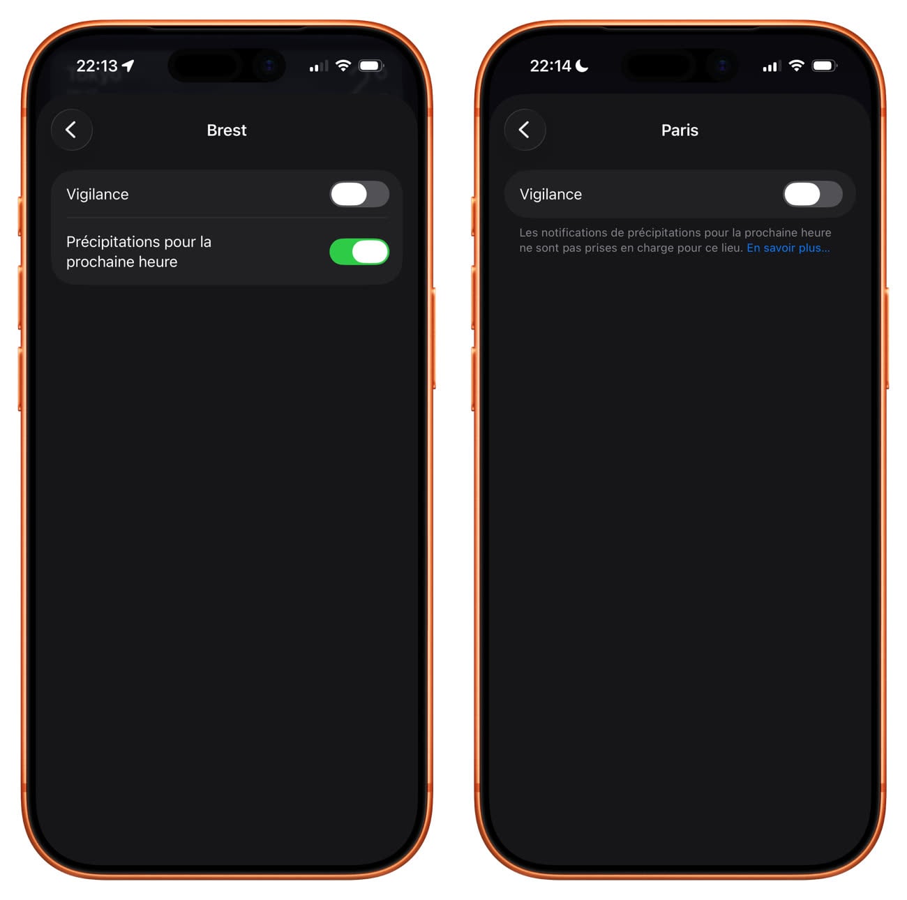 Avantage des Brestois sur les Parisiens : ils peuvent activer les notifications de précipitations pour leur ville. Image iGeneration.