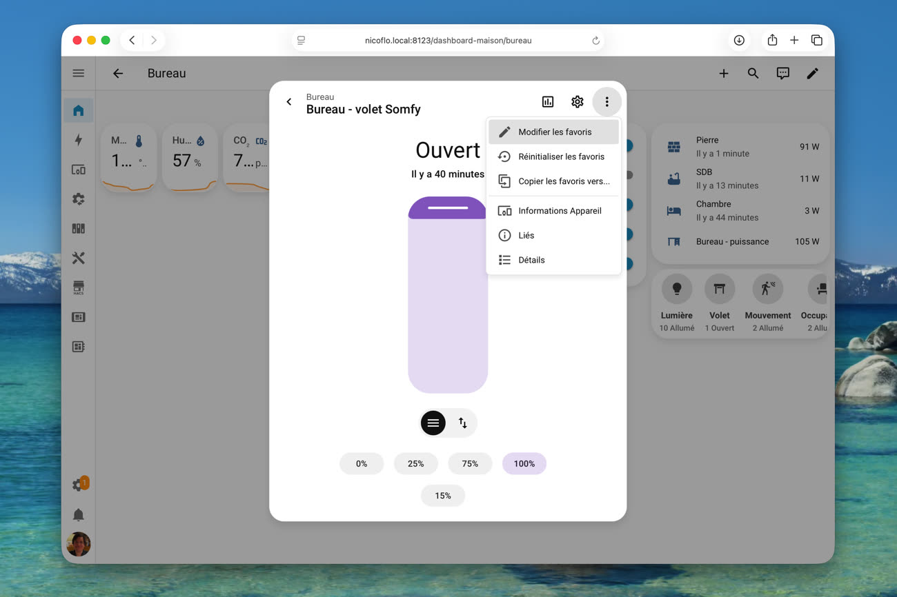 Cette gestion des favoris a été par ailleurs étendue aux ouvertures et aux valves. Si vous avez des volets connectés qui remontent le pourcentage d’ouverture, vous pouvez ainsi leur demander directement une ouverture à 25 ou 50 %, ou même n’importe quelle valeur qui a du sens pour vous. Ces favoris peuvent eux aussi être affichés sur le tableau de bord, ce qui évite d’avoir à créer des scripts ou des cartes complexes pour activer des positions spécifiques.