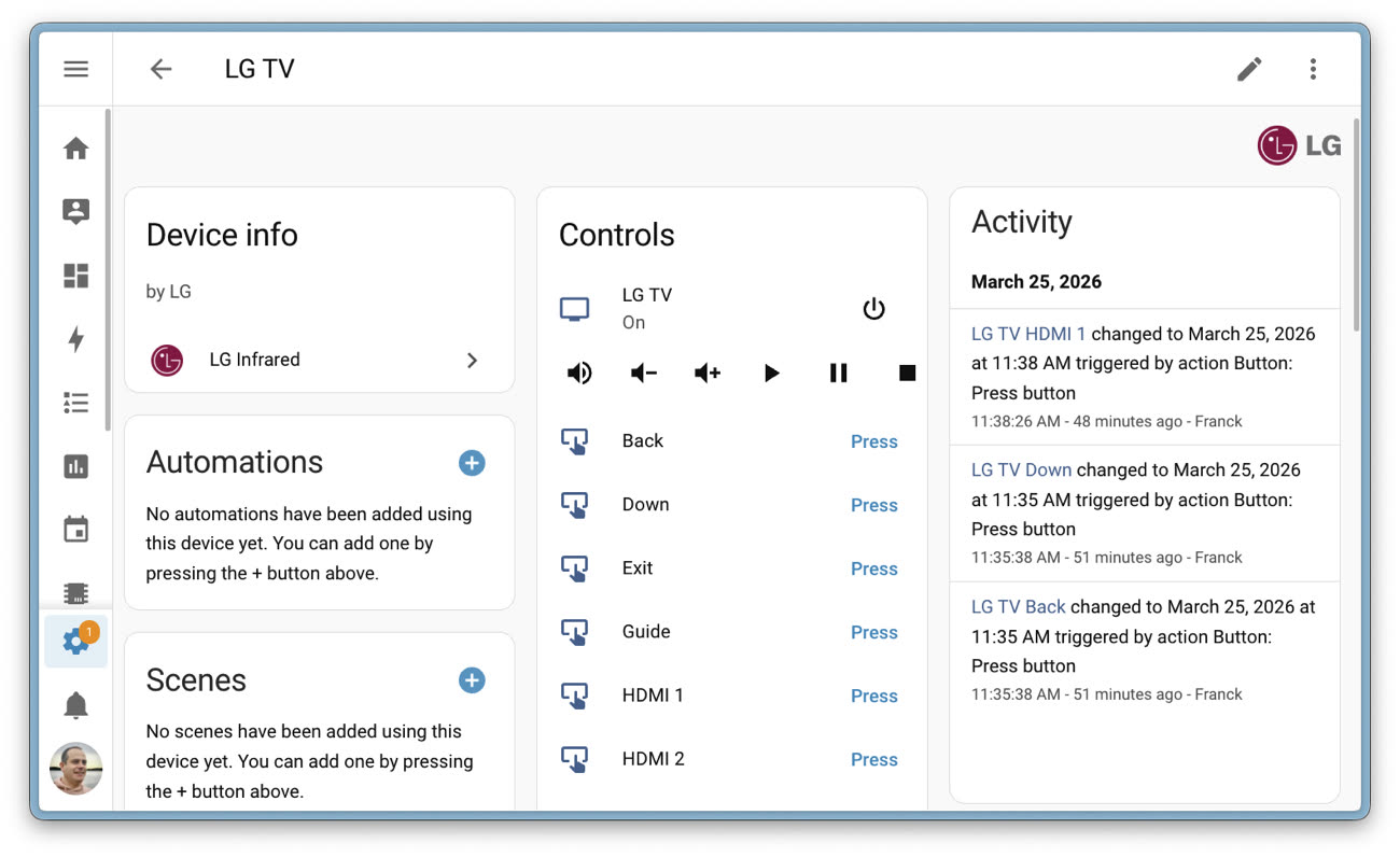 Si une configuration restera nécessaire pour son bon fonctionnement avec la domotique, tout peut se faire en quelques clics depuis ce site web, c’est l’un des gros avantages d’ESPHome. Home Assistant devra ensuite savoir quelles commandes transmettre et c’est pourquoi il faudra s’attendre à de nouvelles intégrations dédiées à des marques. Pour débuter, les téléviseurs LG sont pris en charge par cette première intégration, à configurer une fois le matériel en place. L’infrarouge ne fonctionne que dans un seul sens, si bien que la domotique ne peut pas savoir si la commande a correctement été reçue. Néanmoins, cela reste utile pour intégrer à son installation bon nombre de produits qui resteraient à l’écart autrement.