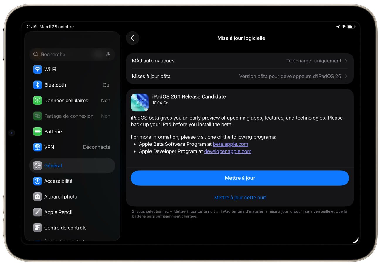 Apple distribue ce soir iOS 26.1, iPadOS 26.1, macOS 26.1, tvOS 26.1, visionOS 26.1 et watchOS 26.1 en release candidate pour les développeurs. C’est la dernière étape avant la sortie de ces mises à jour en version finale pour tout le monde dans quelques jours. À noter la disponibilité d’iOS 18.7.2 et iPadOS 18.7.2 en RC également.