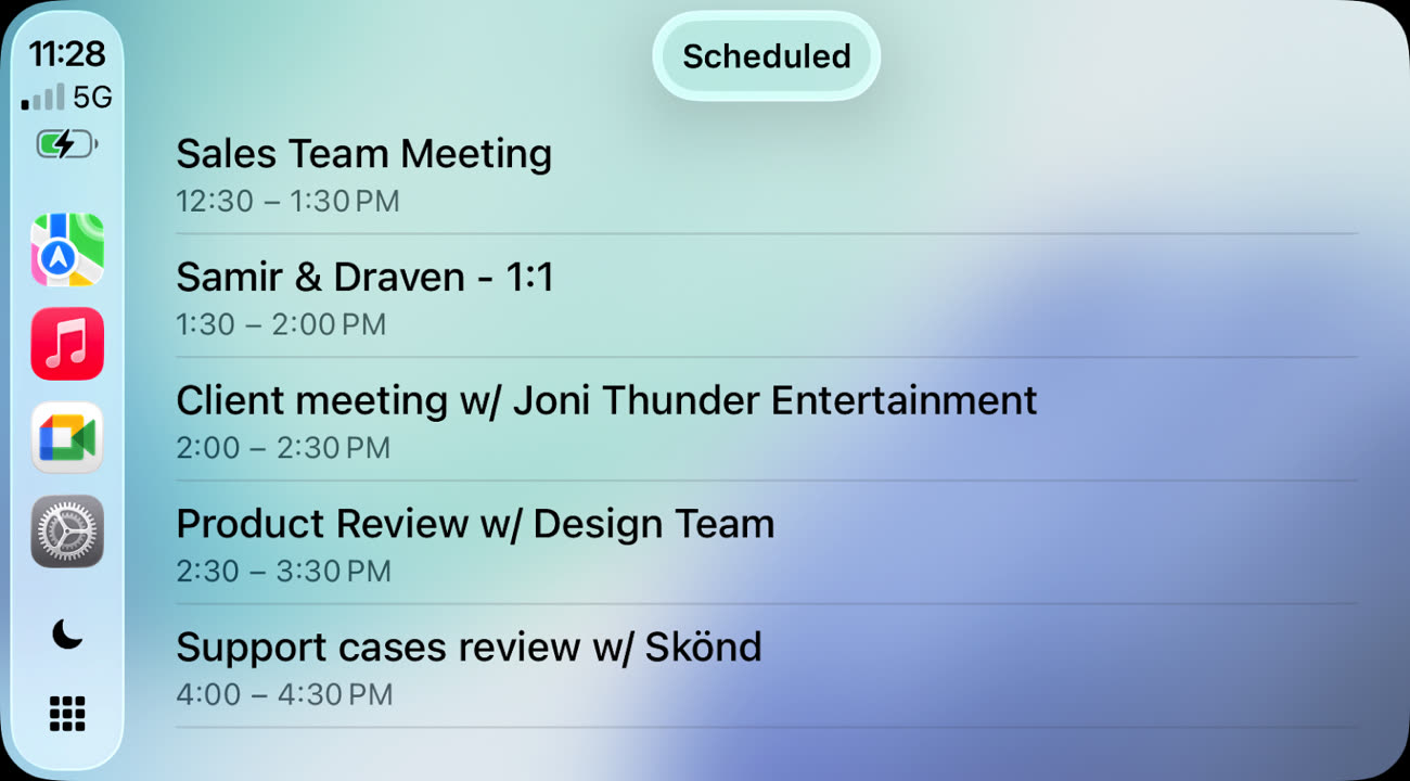Google a adapté l’interface à l’habitacle d’un véhicule, avec une approche logiquement minimaliste. Seules les informations essentielles sont affichées, comme le nom de la réunion ou des participants, ainsi que quelques commandes de base. La vidéo est totalement absente : seul l’audio est pris en charge afin de limiter les distractions au volant.