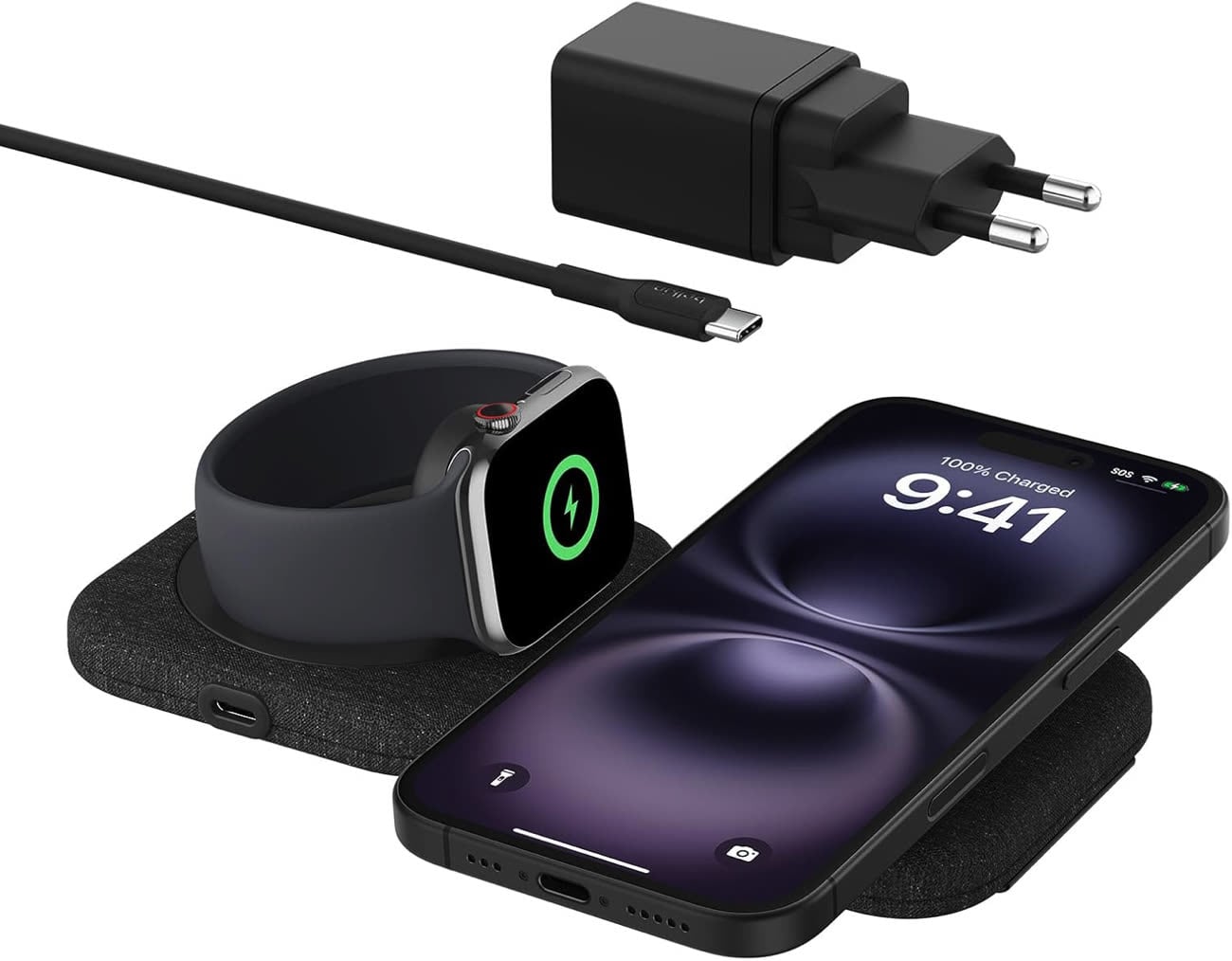Il y a d’autres chargeurs 2-en-1 dans le même esprit. Citons notamment le précurseur Butterfly SE de Twelve South (promo en cours à 69 € au lieu de 109 €) et le charmant Voyage de Native Union (99 €), tous deux vendus sans adaptateur secteur. Ces modèles sont encore plus compacts que celui de Belkin, mais leur position de support est moins stable.