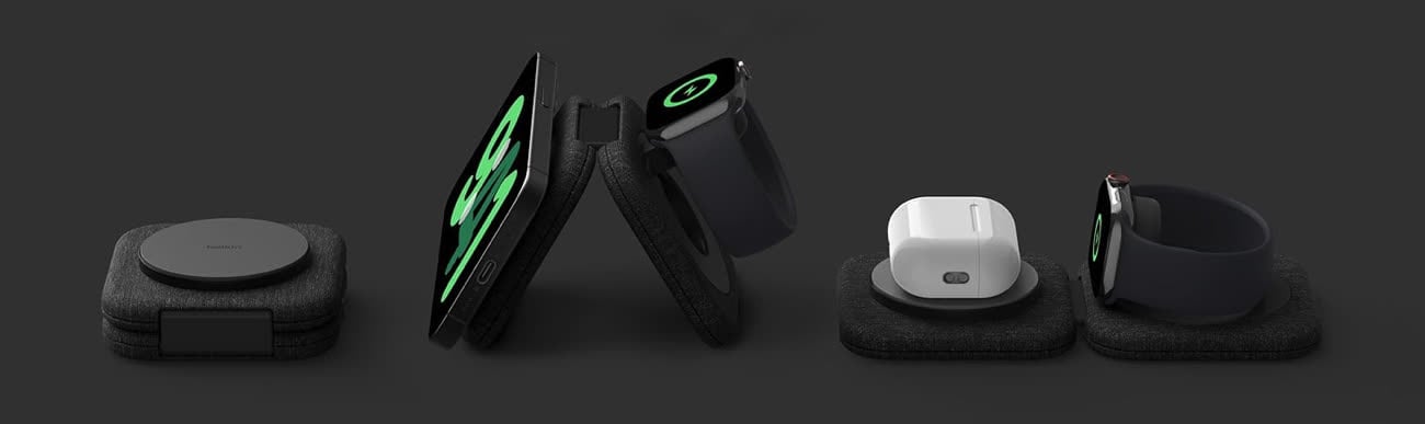 Pensée pour accompagner votre iPhone et votre Apple Watch partout, cette station recouverte de tissu est à la fois compacte (8,2 cm de côté pour 2,8 cm d’épaisseur) et pliable. Elle peut être utilisée à plat ou comme support, ce qui permet d’activer le mode En veille de l’iPhone.
