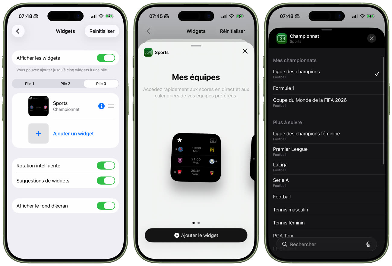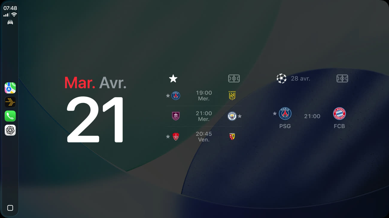 L’ajout des widgets se fait depuis l’iPhone. Dans Réglages, ouvrez « Général », « CarPlay » et choisissez la ligne qui correspond à votre véhicule. Dans « Widgets », vous verrez selon la taille de votre écran jusqu’à trois piles de widgets et vous pourrez alors ajouter ceux fournis par Apple Sports. Le widget « Équipes » se contente d’afficher un calendrier pour vos favoris. « Championnat » ajoute un paramètre supplémentaire, avec la possibilité de choisir le championnat à suivre parmi tous ceux proposés par l’app.