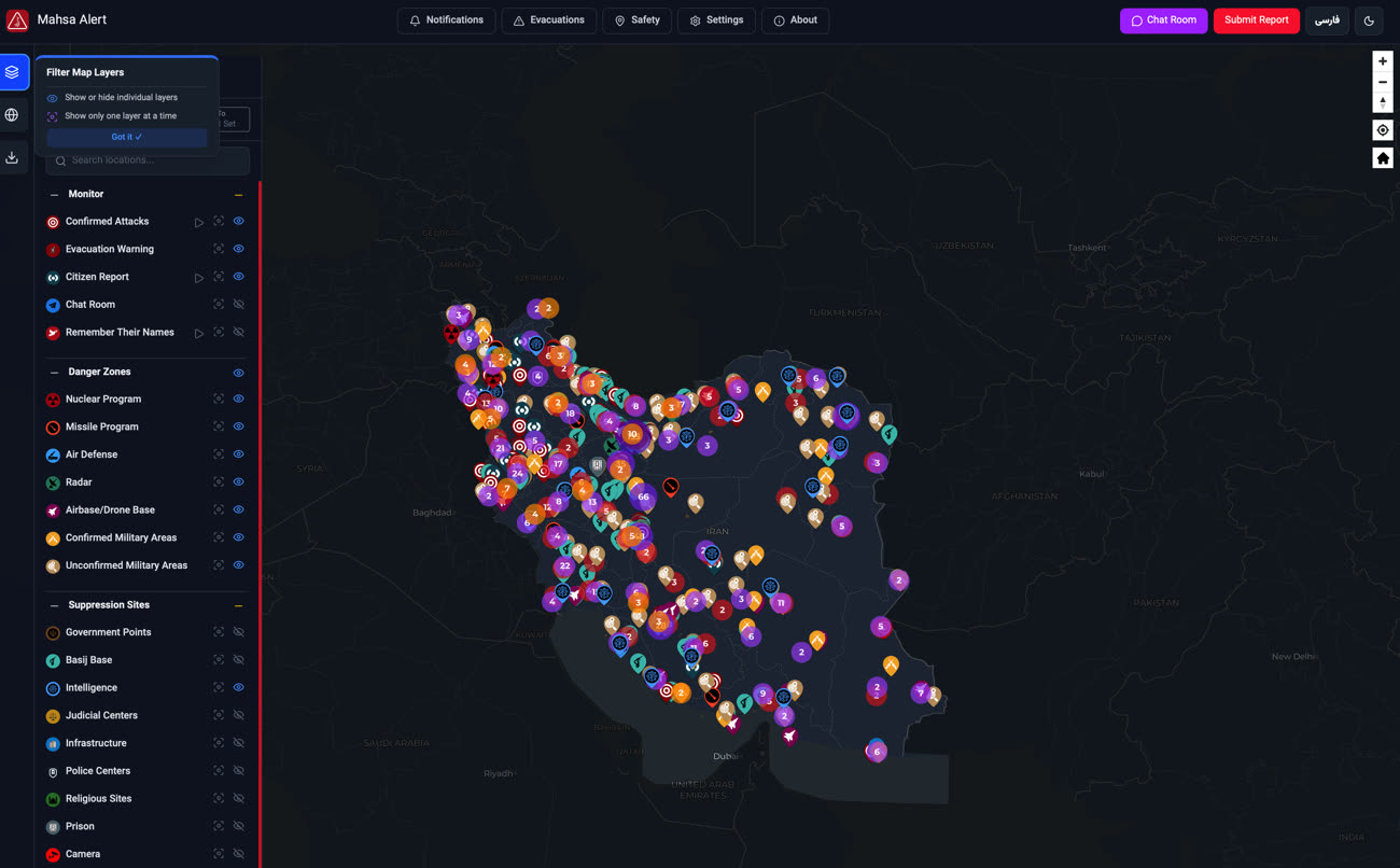 Mais Mahsa Alert va plus loin que la simple alerte missile. C'est une véritable carte de survie qui recense :