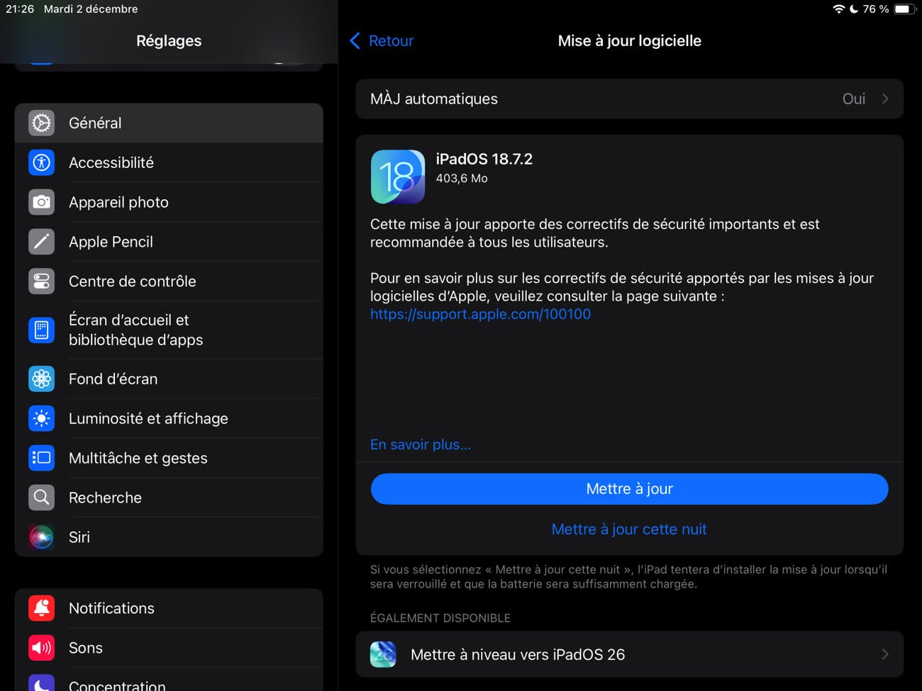 Côté iPad, d’après nos constatations sur un iPad mini 5 resté sur iPadOS 18, iPadOS 26 est toujours affiché en second choix pour l’instant.