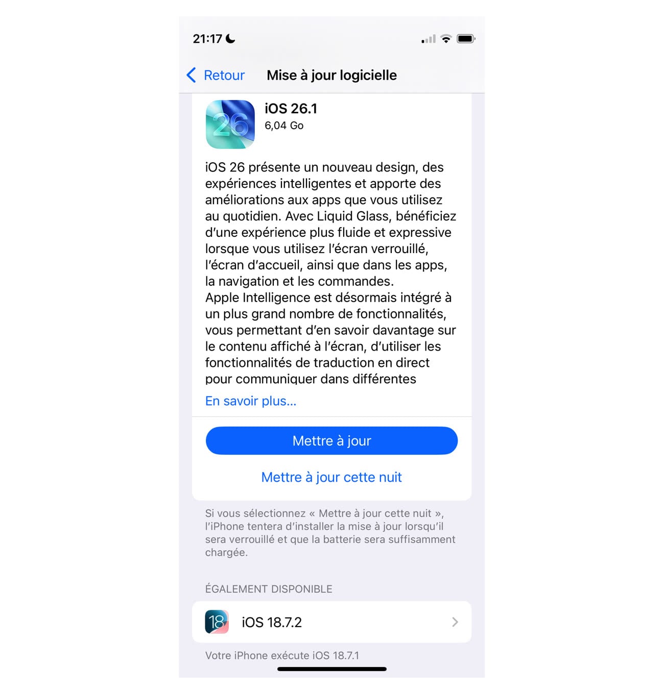 C’est la stratégie habituelle de la Pomme : au fur et à mesure que la dernière version majeure gagne en stabilité, elle est davantage mise en avant. Rien ne vous empêche de rester pour l’instant sur le cycle d’iOS 18 si vous le préférez. La version 18.7.2, publiée début novembre, a d’ailleurs bouché des failles.