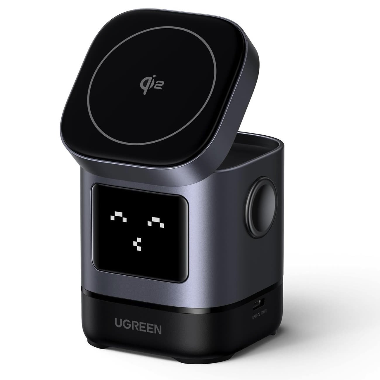 La station de charge Qi2 (15 W) d'Ugreen est en promotion à 40 € au lieu de 60 €. C'est un modèle doté d'un emplacement Qii2 magnétique qui permet d'orienter l'iPhone dans différentes positions, mais la station intègre aussi un second emplacement Qi, qui cible spécifiquement les AirPods mais qui peut servir pour d'autres appareils. C'est aussi et surtout un périphérique assez mignon, avec un petit écran monochrome qui affiche un visage souriant et s'anime lors de la charge.
