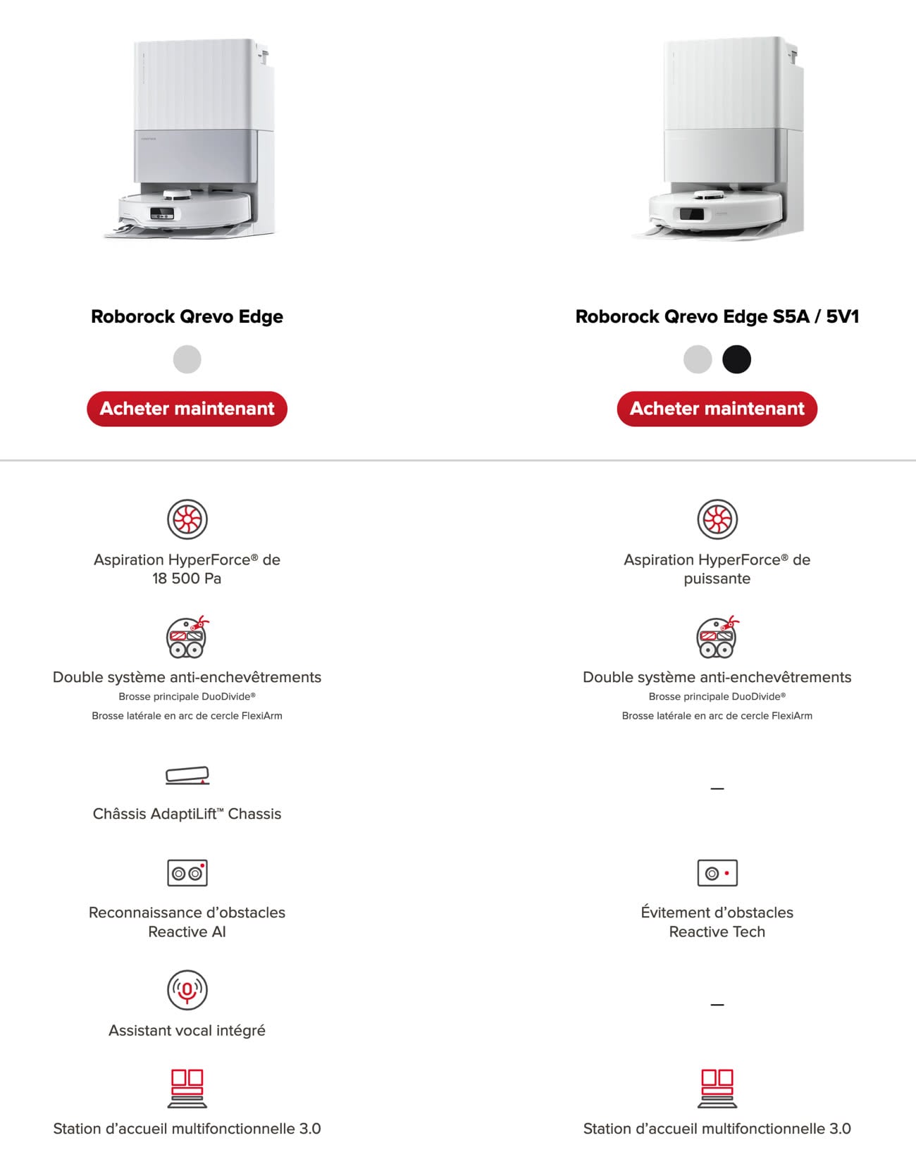 Attention néanmoins, le Qrevo Edge S5A n’est pas strictement identique. Comme l’explique Roborock, les deux versions ont de nombreuses caractéristiques en commun : puissance d’aspiration de 18 500 Pa ; système anti-enchevêtrements ; brosse latérale et serpillière FlexiArm ; station d’accueil multifonctionnelle.