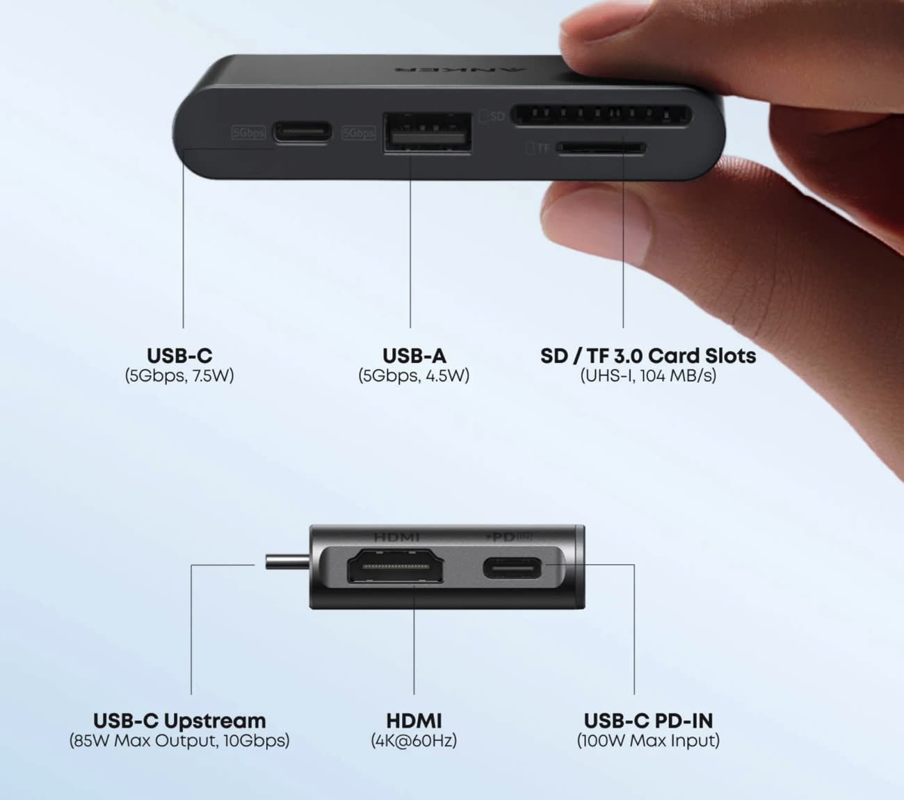 Quand on est en vadrouille, on a à sa disposition le petit USB-C qui comprend 6 ports : une sortie USB-C (5 Gb/s, 7,5 W), un USB-A (5 Gb/s, 4,5 W), des lecteurs de cartes SD et microSD, une sortie HDMI (4K 60 Hz) et une entrée USB-C (100 W). Il permet par exemple de connecter un MacBook Air à un téléviseur ou d’y brancher un vieux périphérique.