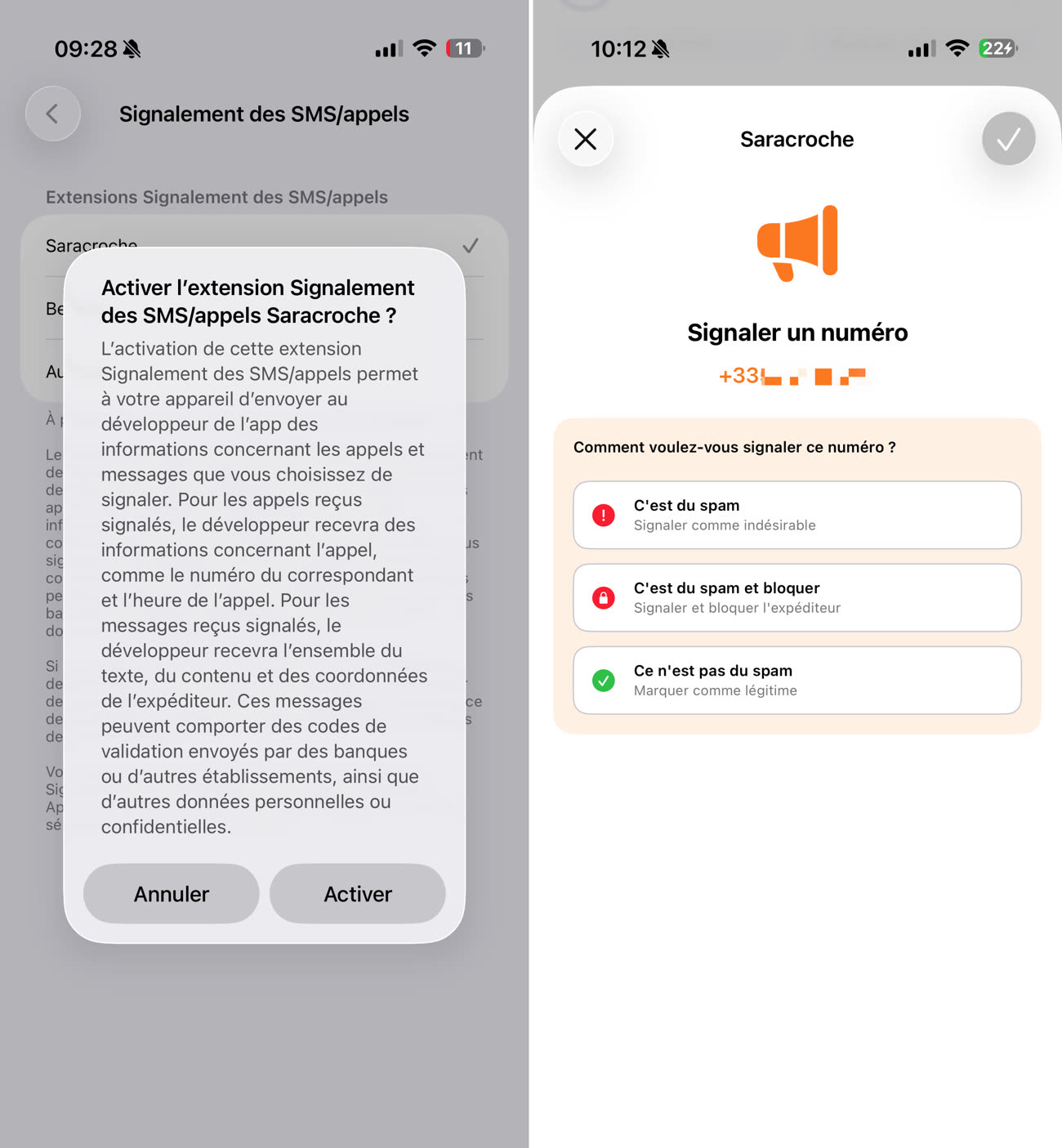 Sur un autre registre, l’app laisse désormais signaler les appels indésirables directement depuis le journal d’appels. Il faut ici l’activer dans les réglages de l’app Téléphone, rubrique Signalements des SMS/Appels. Une fois cela fait, on peut faire un glissement vers la gauche sur un numéro inconnu : une petite main orange devrait apparaître, laisse signaler le numéro à Saracroche.