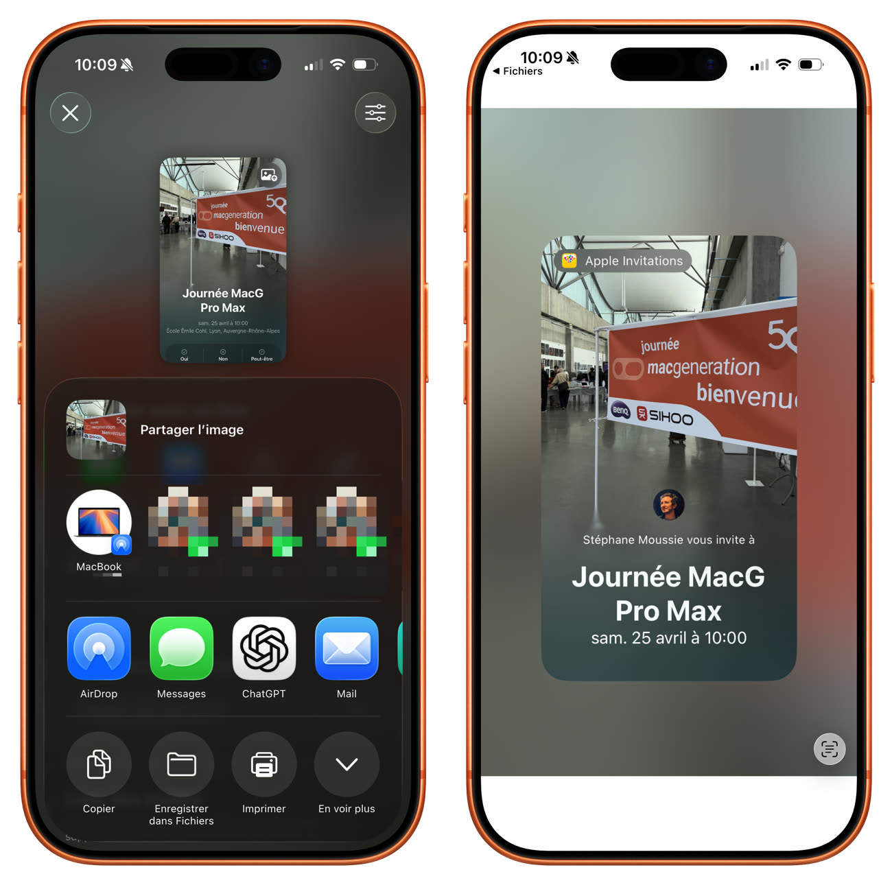 On peut aussi télécharger une image du carton d’invitation pour la partager n’importe où. Pour ceci, il faut d’abord appuyer sur le bouton « Inviter des personnes », puis appuyer sur l’image en haut de l’écran. Le menu de partage d’iOS s’ouvre alors avec les options classiques.