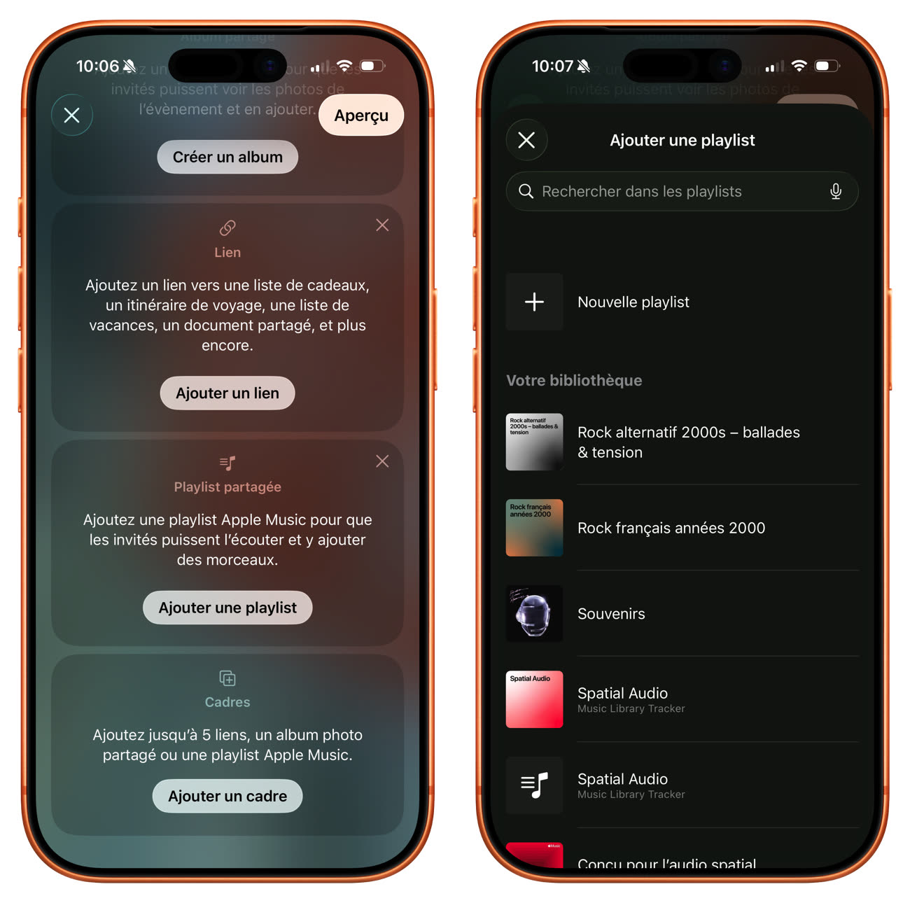 De plus, on peut maintenant préciser le fuseau horaire pour s'assurer que les invités qui viennent de loin arrivent à la bonne heure. Toujours lors de la création d’un événement, le cadre « Playlist partagée Apple Music » propose désormais des suggestions de playlists