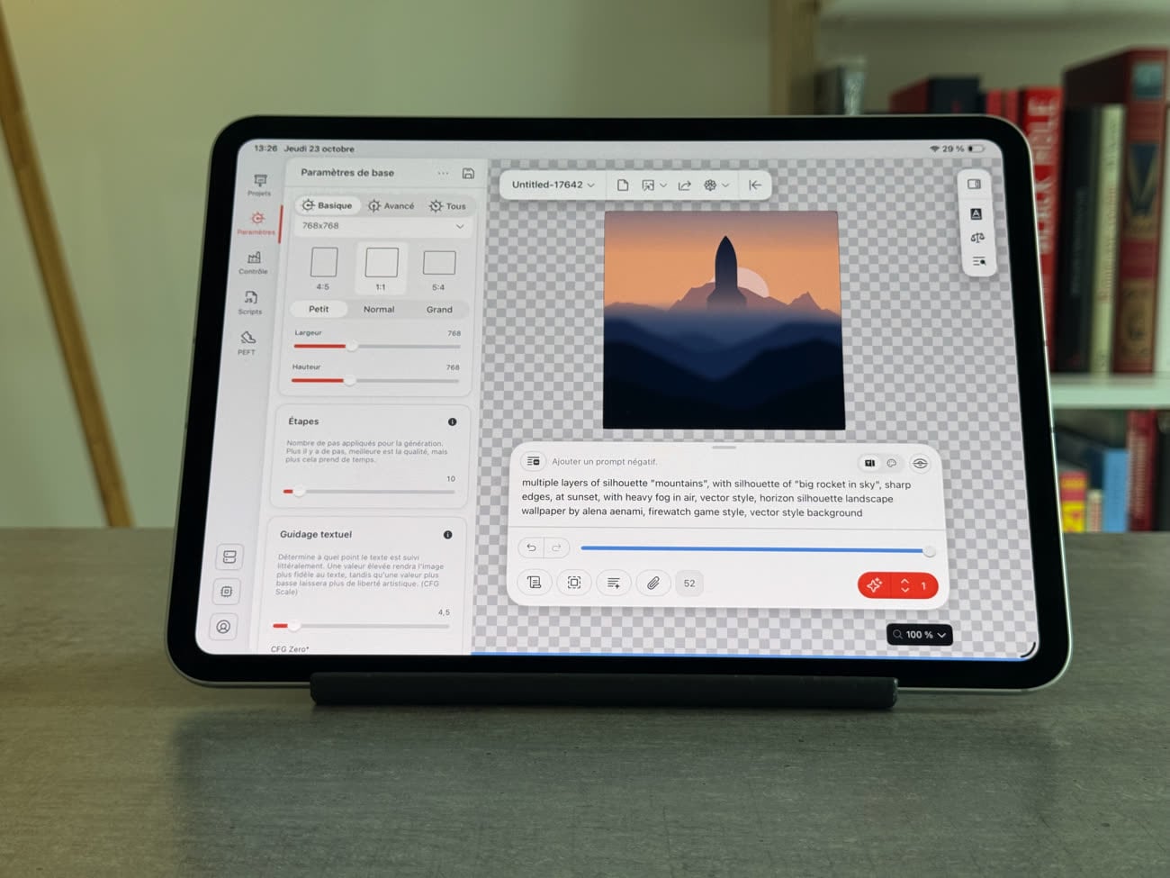 Ces progrès importants sur la partie graphique profitent cependant à tout ce qui touche à l’IA en local. Ce n’est pas le plus simple à tester : les fonctions Apple Intelligence restent peu nombreuses et pas vraiment exigeantes. L’écosystème d’apps tierces est moins développé que sur Mac, et les ingénieurs de Cupertino n’ont jamais trouvé le temps de publier une petite app pour faire tourner un LLM en local sur iPad. Nous avons donc testé les avancées avec Draw Things, un générateur d’images pouvant exploiter tout un tas de modèles et mis à jour à l’occasion de l’arrivée de la puce M5.