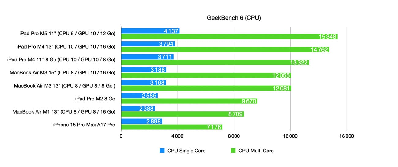 Nous avons donc fait passer la batterie de tests habituelle à cet iPad, à commencer par Geekbench 6. En comparant les tablettes d’entrée de gamme du même format de 2024 et 2025, on observe une progression de 11 % en single core et de 15 % en multi core par rapport au M4.