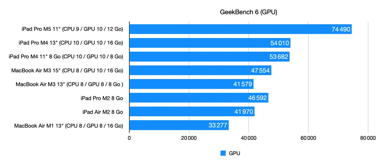 L’amélioration est bien plus marquée sur le GPU avec une hausse de… presque 40 % d’une année sur l’autre ! Les tests sur Geekbench 6 sont parlants, et le petit iPad Pro se retrouve loin devant le modèle de l’année dernière ou même un MacBook Air M3. La tablette est deux fois plus rapide que mon MacBook Air M1 !