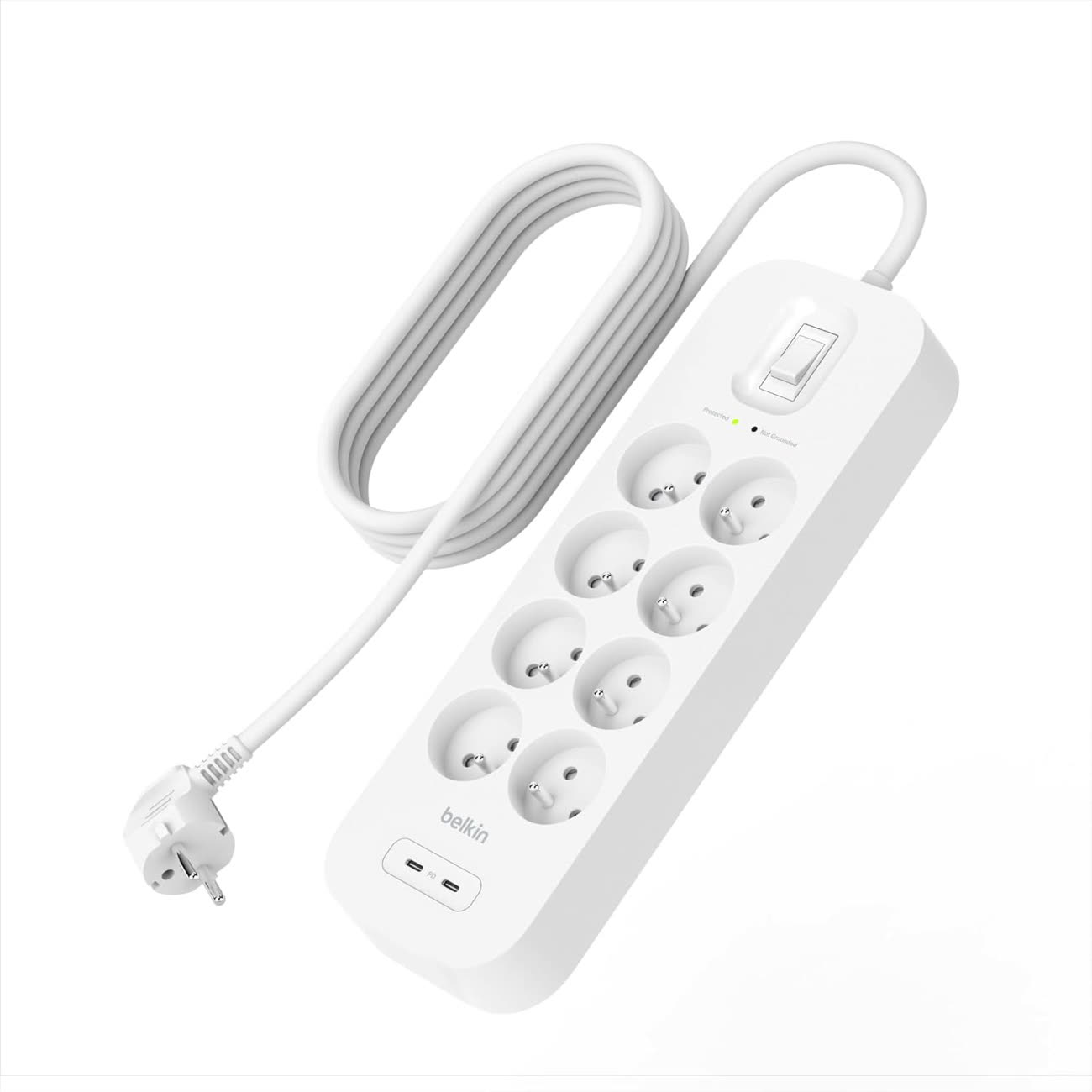 La multiprise avec 8 prises et deux ports USB-C est en promo à 38 €, une réduction de 31 % par rapport au prix conseillé, à 55 €. Ce produit est équipé d’une protection contre les surintensités et les surcharges jusqu'à 900 joules. Son câble mesure 2 mètres et un support mural intégré permet de fixer le bloc sur un mur ou sous un bureau. Un bouton marche/arrêt permet de couper facilement l’alimentation.