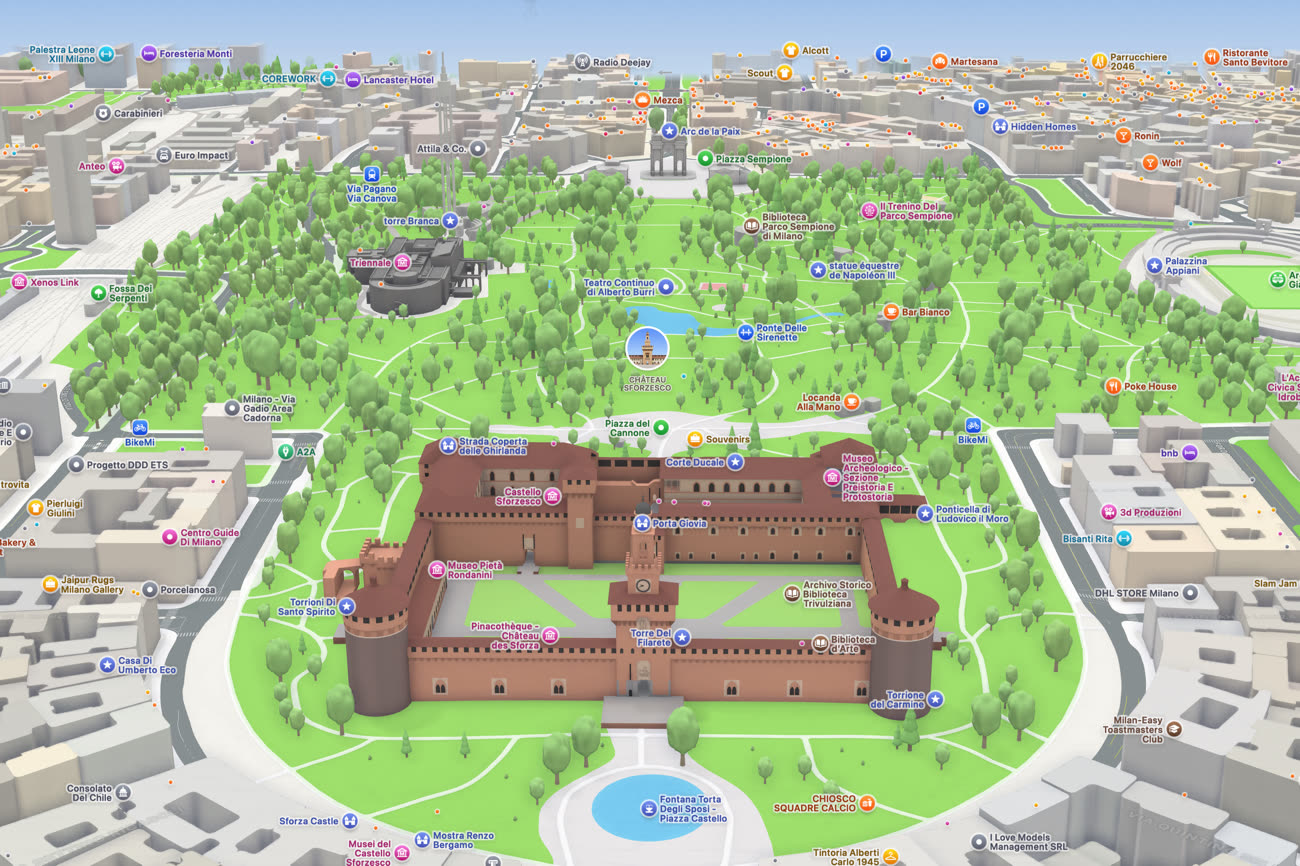 Petit à petit, très lentement, Apple Plans complète sa collection de villes avec une expérience plus détaillée, « Detailed City Experience » ou DCE pour les intimes. L’année 2026 commence avec l’ajout de Milan en Italie, où l’on peut admirer quelques bâtiments modélisés en 3D et surtout avec des couleurs qui ajoutent une touche de réalisme. Parmi les bâtiments concernés, il y a plusieurs monuments de la ville, dont le château des Sforza en plein cœur historique ou encore la massive cathédrale (le Dôme de Milan). On retrouve aussi la boutique milanaise d’Apple, qui fait forte impression elle aussi dans un tout autre genre.