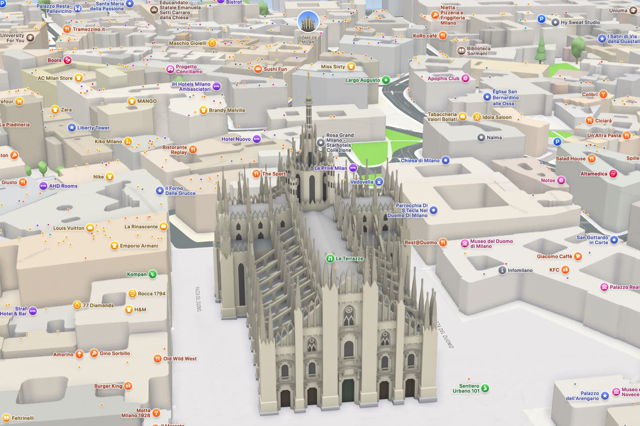Ce mode s’ajoute au survol FlyOver qui se base sur les photographies satellites appliquées aux modèles 3D des bâtiments. Cette fois, c’est la vue standard qui est concernée : en basculant en 3D, on voyait déjà les formes grossières des immeubles, une fonctionnalité présente un petit peu partout. La particularité supplémentaire du DCE, c’est la représentation améliorée de quelques bâtiments dans une ville, comme ici à Milan.