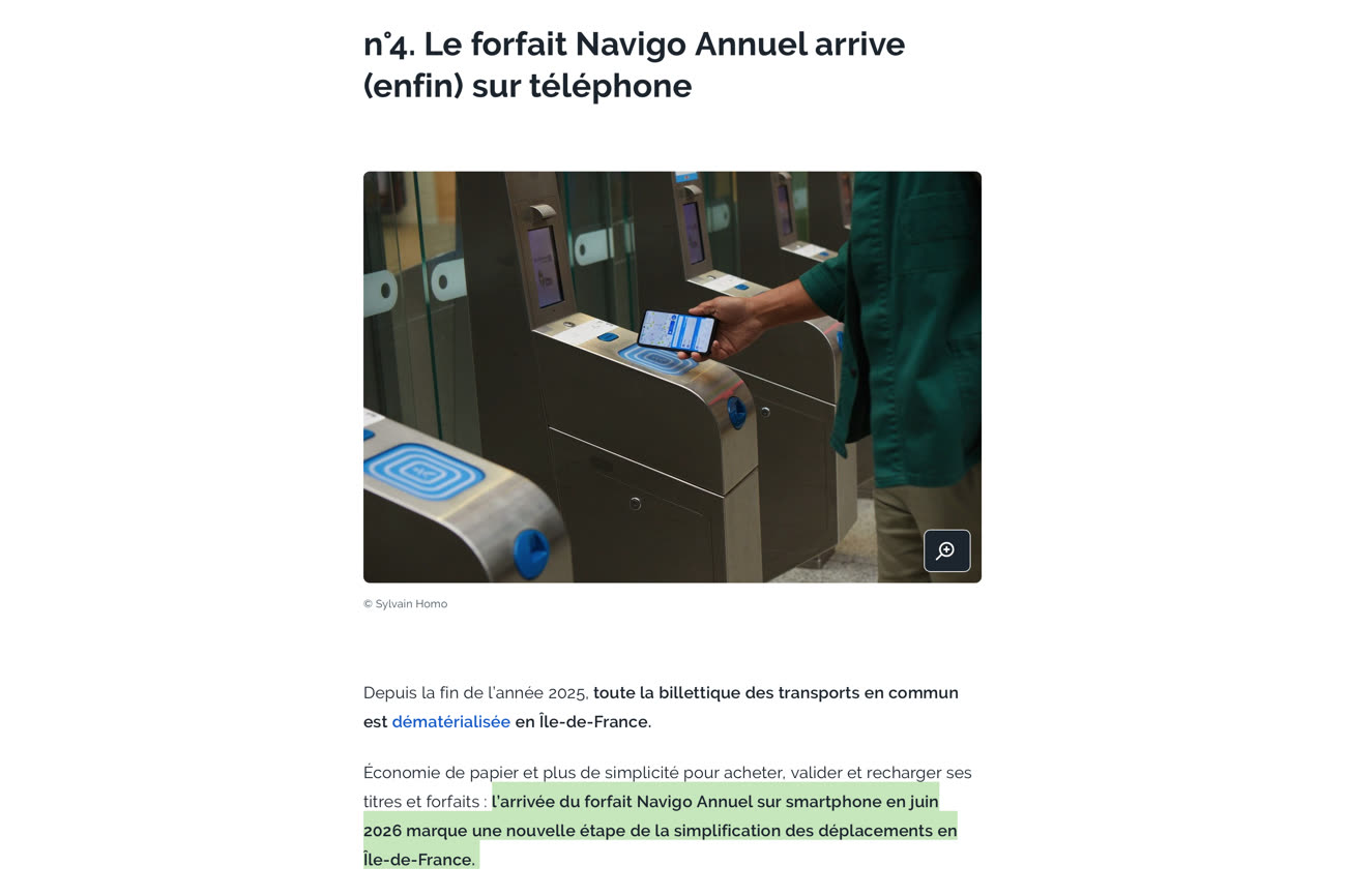 « L’arrivée du forfait Navigo Annuel sur smartphone à l'été 2026 marque une nouvelle étape de la simplification des déplacements en Île-de-France », indique l’établissement public. Le retard n’est pas clairement officialisé, mais il s’agit d’un décalage par rapport aux précédentes annonces.
