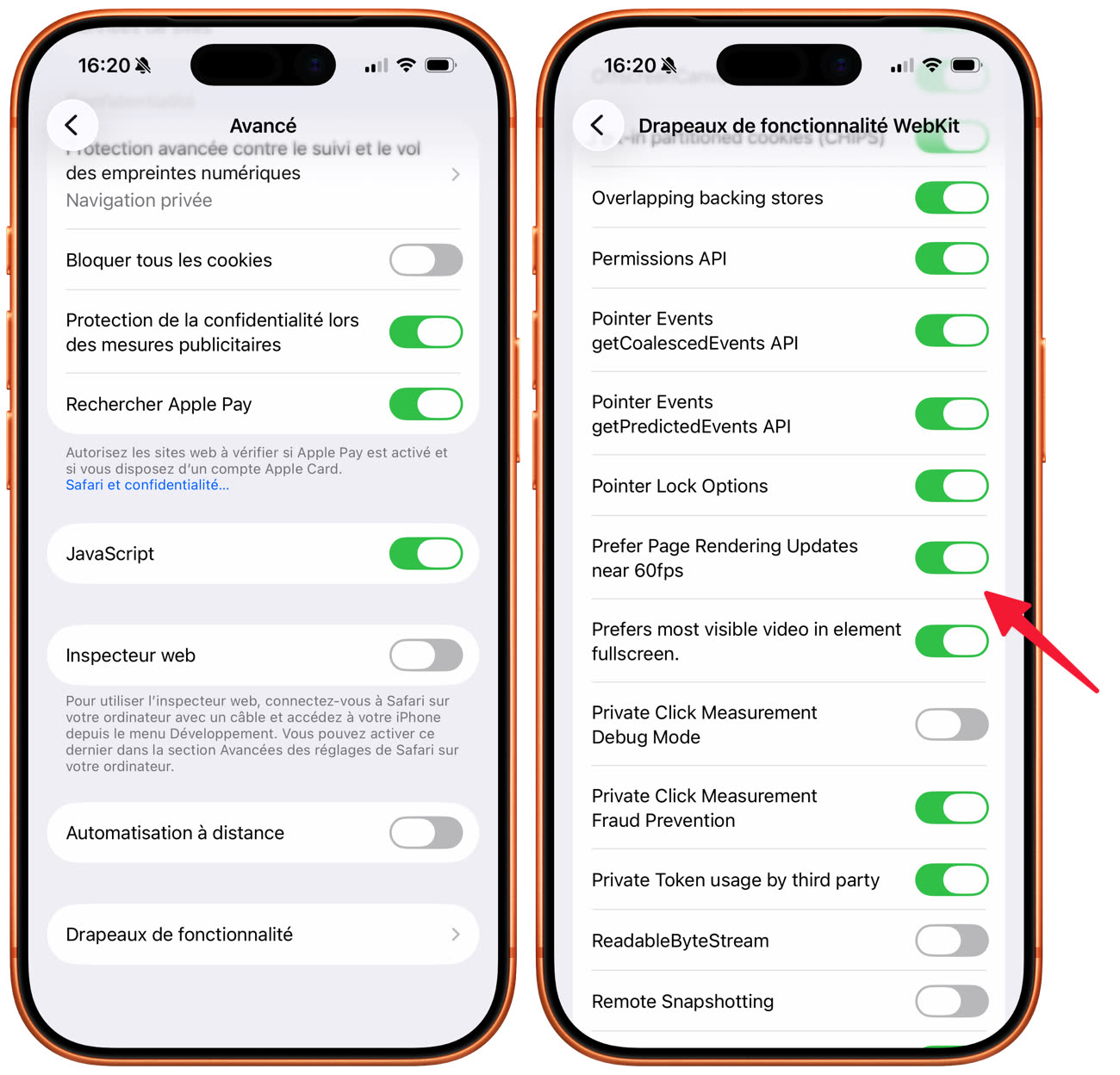 L’option présentée comme responsable du bridage à 60 Hz se trouve ici : Réglages > Apps > Safari > Avancé > Drapeaux de fonctionnalité > Prefer Page Rendering Updates near 60fps. Un tour sur le site testufo, qui permet de vérifier certaines caractéristiques d'affichage, semble indiquer que Safari est limité à 60 Hz (le compteur est bloqué à 60 fps), ce qui entretient la confusion.