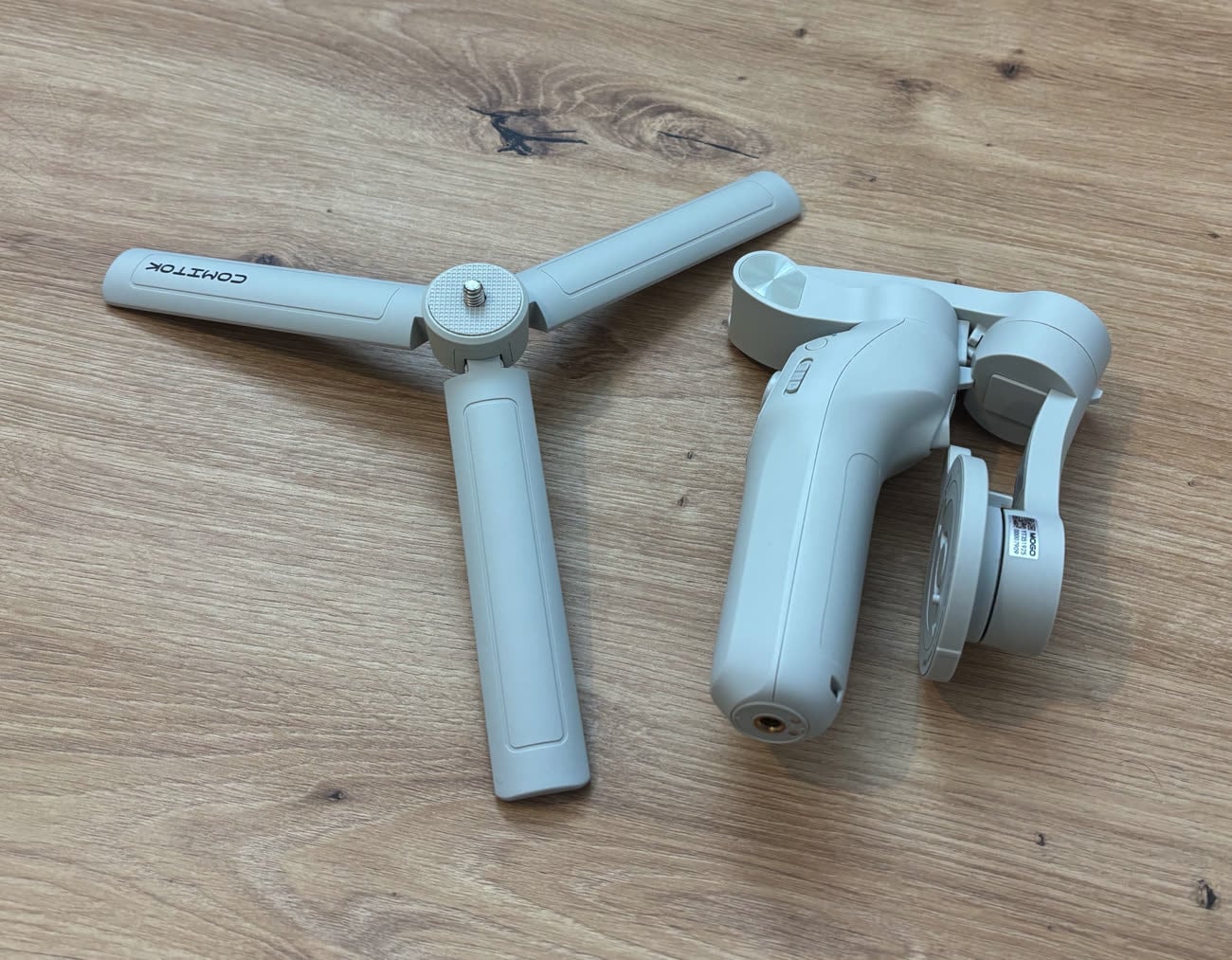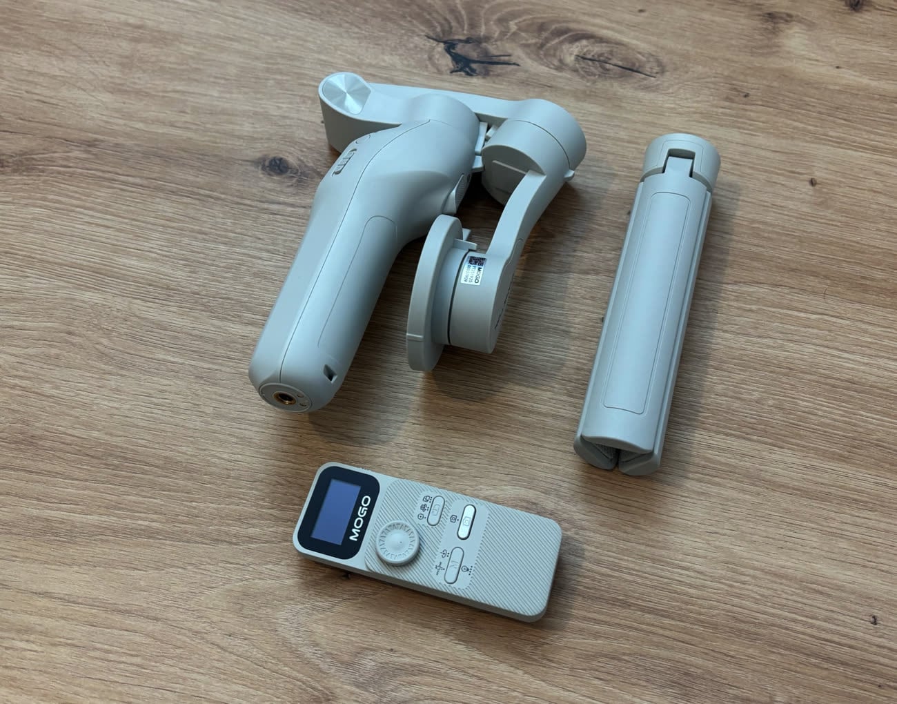 Sur les stabilisateurs concurrents, les fabricants intègrent des trépieds rétractables dans la poignée, qui se déploient facilement. C'est une solution d'appoint dont la stabilité n'est pas parfaite, mais c'est très pratique si vous avez besoin de positionner votre stabilisateur sur un point fixe. Le Mogo, lui, reprend le procédé des anciens modèles de DJI (comme un Mobile 4) : un trépied externe, qui se place au niveau du pas de vis sous la poignée. C'est plus encombrant, un peu plus lourd — le Mogo pèse 343 grammes sans trépied, 434 grammes avec, quand le Flow 2 Pro est à 389 grammes — mais aussi plus stable, notamment sur des surfaces un brin branlantes.