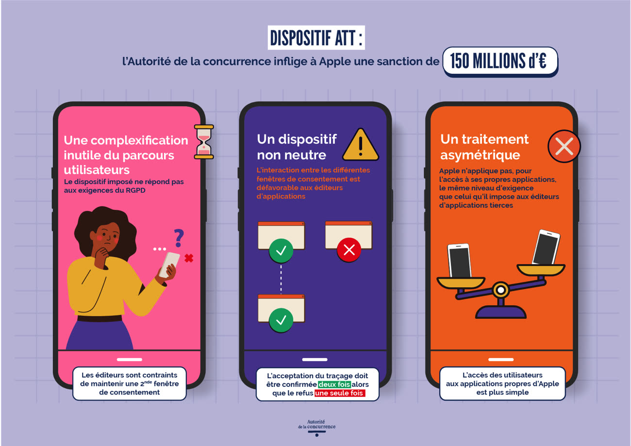 Apple reste toutefois loin d’être irréprochable. Lors de l’introduction d’ATT en 2021, la firme avait “oublié” de s’appliquer la règle à ses propres apps. C’est d’ailleurs ce que pointe l’Office fédéral allemand de la concurrence, qui estime que ses règles n’empêchent pas Cupertino de combiner les données issues de l’App Store, de l’Apple ID ou des appareils connectés à des fins publicitaires. En France, Apple a écopé d’une amende de 150 millions d’euros pour abus de position dominante dans une affaire similaire — une décision contre laquelle l’entreprise a fait appel.