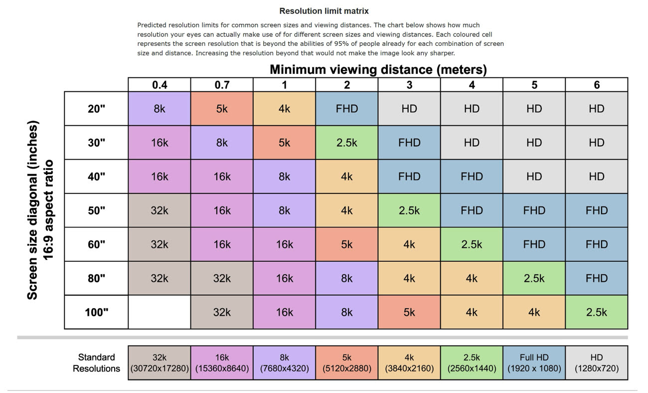 La 8K, c'est quoi ? Une définition de 7 680 × 4 320, soit quatre fois plus de pixels qu'en 4K. Et c'est cette densité qui bloque un peu la technologie, il faut l'avouer. Premièrement, la densité est telle qu'il faut une dalle extrêmement grande pour commencer à voir une réelle différence entre une dalle 4K et une 8K. Typiquement, même en prenant un modèle de 80 pouces, il faut être à environ deux mètres pour réellement discriminer du 4K et du 8K1. Avec trois mètres de recul, vous ne verrez plus la différence. Sur les diagonales plus faibles, c'est peine perdue : la différence entre 4K et 8K est imperceptible.