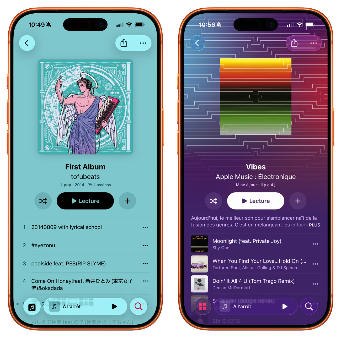 Dans la vue d’un album ou d’une playlist, la liste des titres adopte désormais une couleur de fond assortie à la teinte dominante de la pochette. C’est plutôt sympa si vous voulez mon avis, mais si vous préférez l’ancienne présentation sur fond blanc, il n’existe pour l’instant aucun réglage pour y revenir. Cette évolution ne se limite pas aux abonnés Apple Music, elle s’applique également à l’application Musique utilisée sans abonnement.
